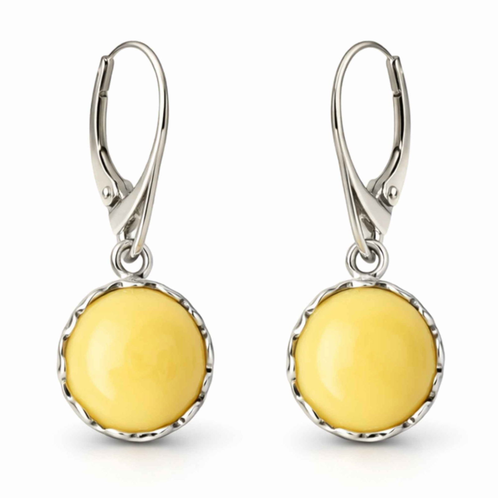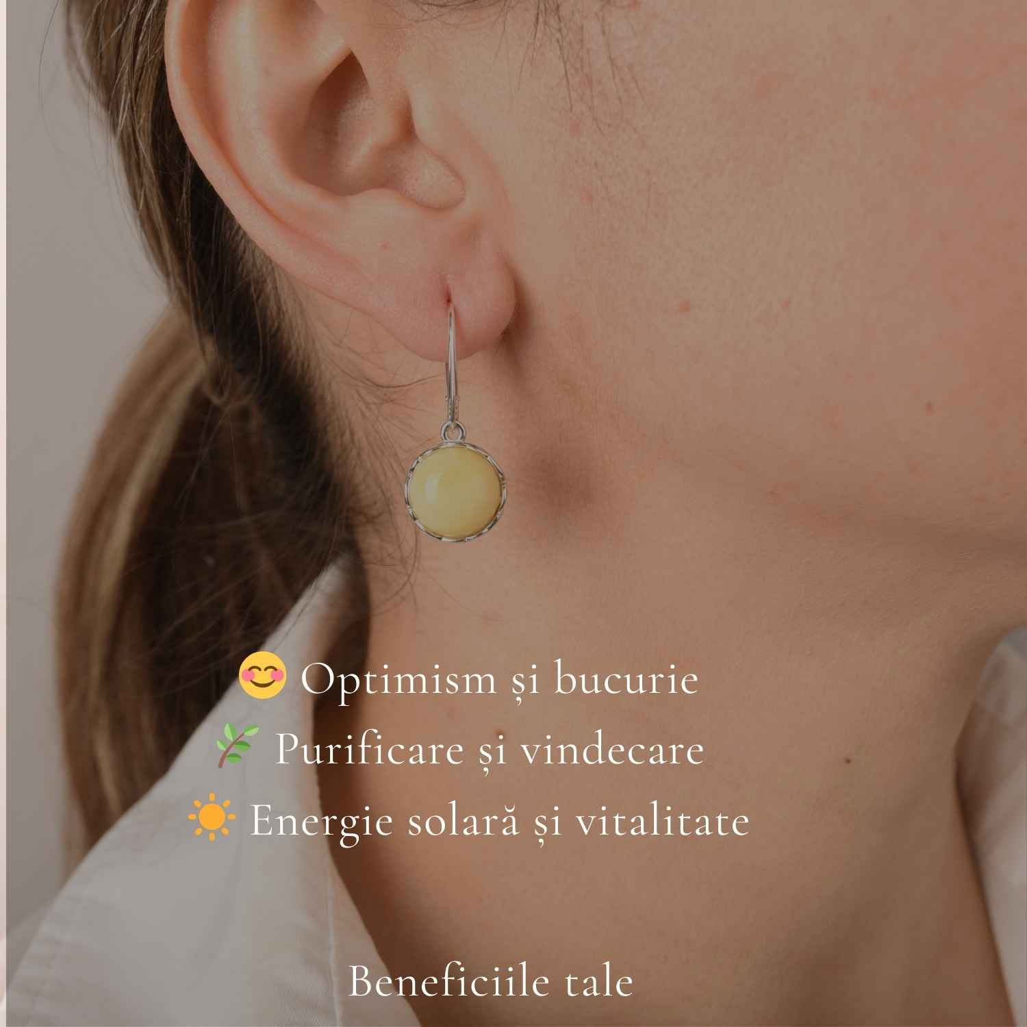 Îți pui cerceii înainte să pleci la o întâlnire sau la o zi obișnuită la birou. Chihlimbarul galben captează lumina într-un mod cald și discret, iar designul rotund completează perfect orice ținută.