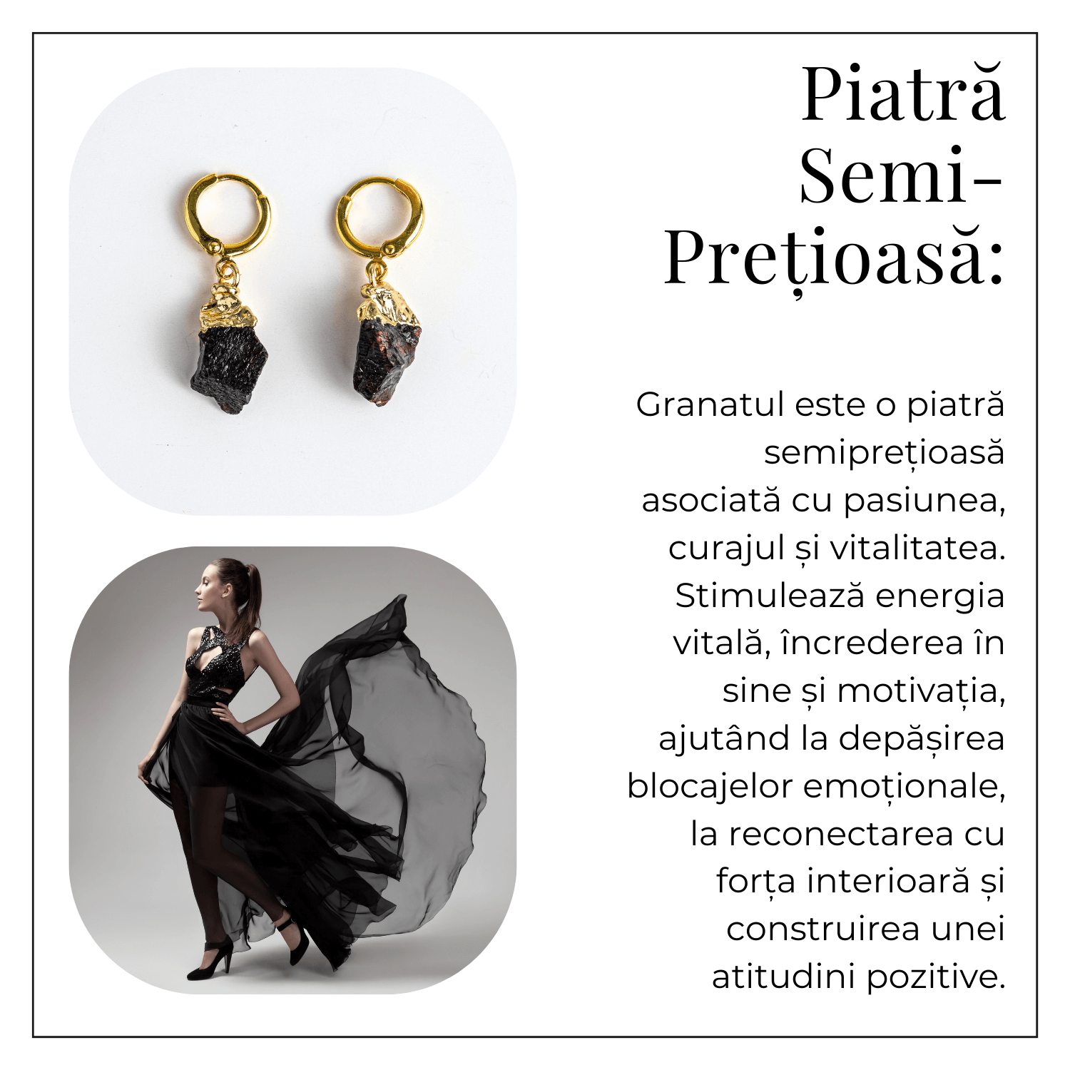 Granatul este considerat un simbol al energiei, pasiunii și vitalității. Acesti cercei sunt ideali pentru cei care doresc să atragă mai multă energie pozitivă în viața lor, protejându-se totodată de orice vibrații negative. Cu fiecare purtare, vei simți revitalizare, protecție și un impuls de încredere în forțele tale interioare.