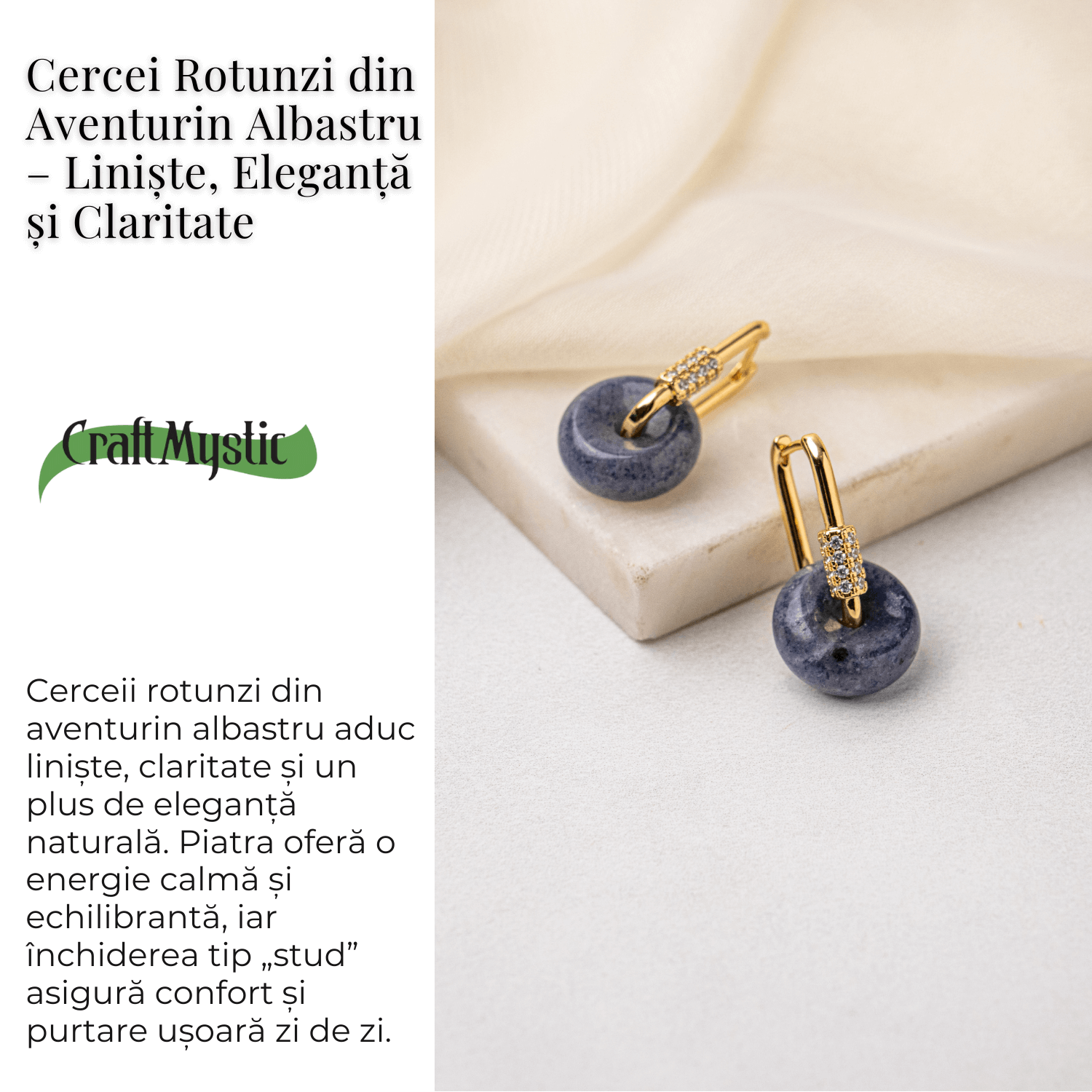 Acesti cercei imbina stralucirea aurie cu profunzimea Aventurinului Albastru, creand o bijuterie ce transmite calm, siguranta si armonie interioara.