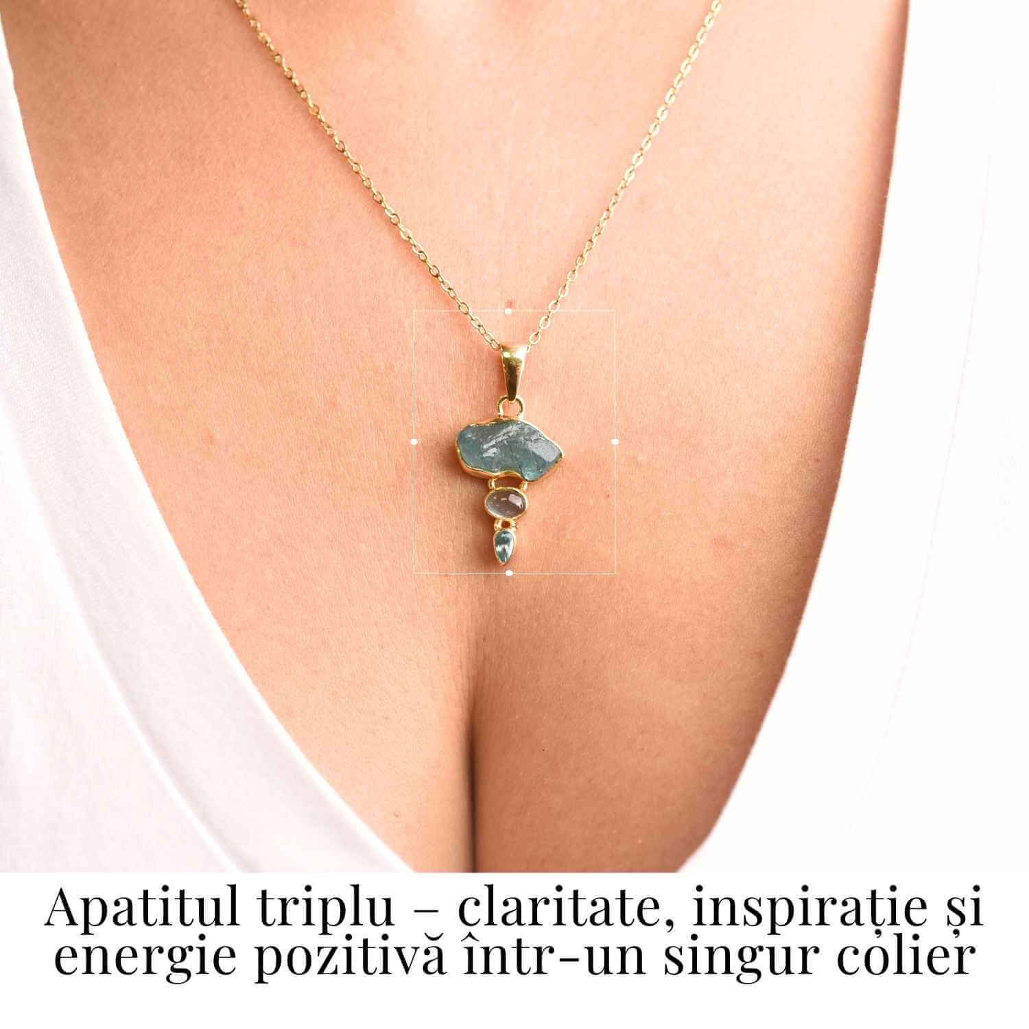 Colierul cu triplu apatit îți oferă o energie proaspătă, îți limpezește gândurile și îți întărește vocea interioară. Cele trei pietre – una brută, una rulată și una fațetată – acționează în armonie pentru a te ajuta să comunici cu sinceritate și încredere, reducând stresul și blocajele emoționale.