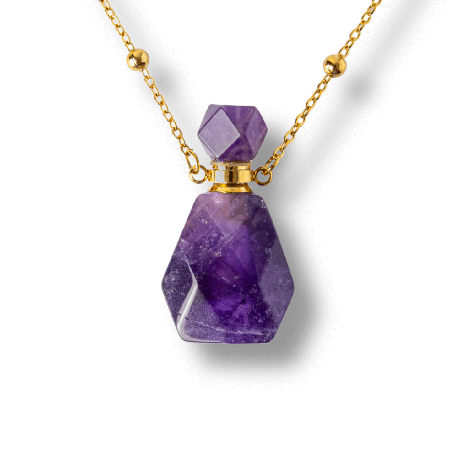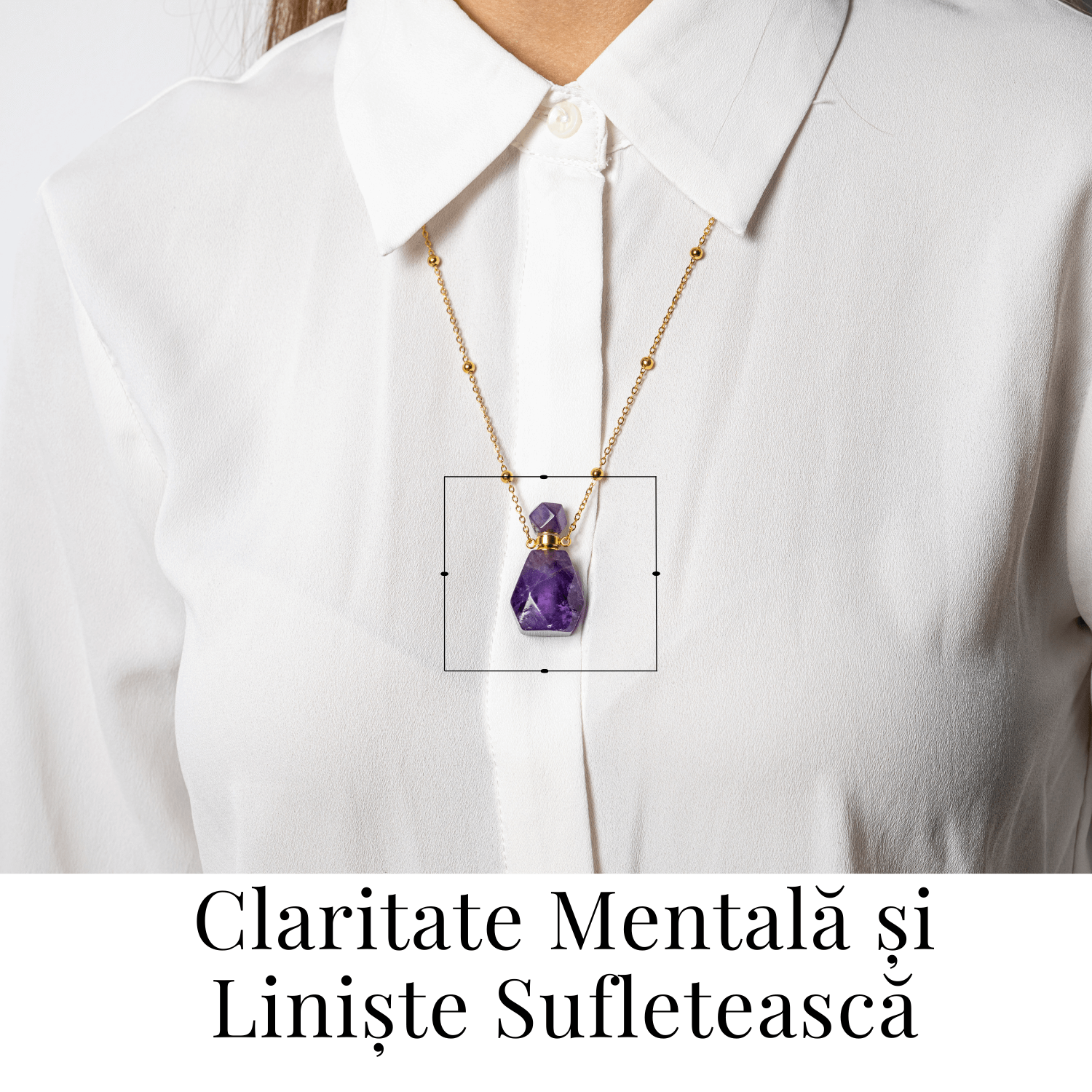 Acest colier cu pandantiv sticluta din ametist natural fatetat este un simbol al echilibrului interior si al protectiei spirituale. Forma de sticluta sugereaza un recipient al esentei sufletului, dar si un talisman practic, in care poti pastra parfum, uleiuri esentiale sau esente sacre. Ametistul, cu nuantele sale violete, reprezinta liniste, claritate si conexiune divina, fiind de secole o piatra a intelepciunii si a purificarii.