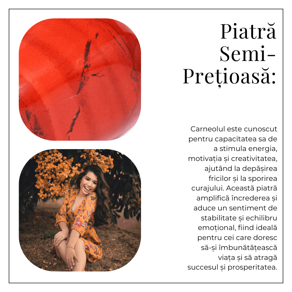 • Vitalitate și energie pozitivă: Carneolul este cunoscut pentru capacitatea sa de a stimula energia fizică și de a îmbunătăți starea generală de bine.