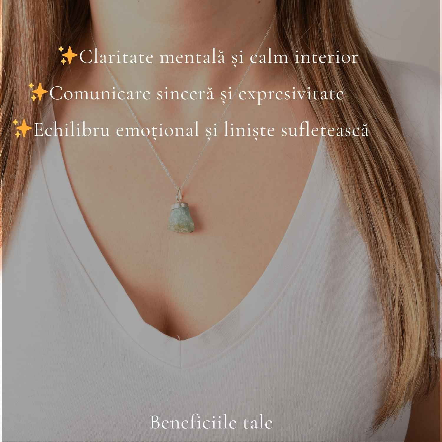 Îți imaginezi o zi liniștită în care alegi o ținută simplă, iar acest colier devine detaliul care atrage privirea. Nuanța acvamarinului prinde lumina discret și oferă un aer elegant și natural. La 3.04 g este ușor, îl vei uita că îl porți, dar energia și frumusețea lui rămân mereu cu tine.
