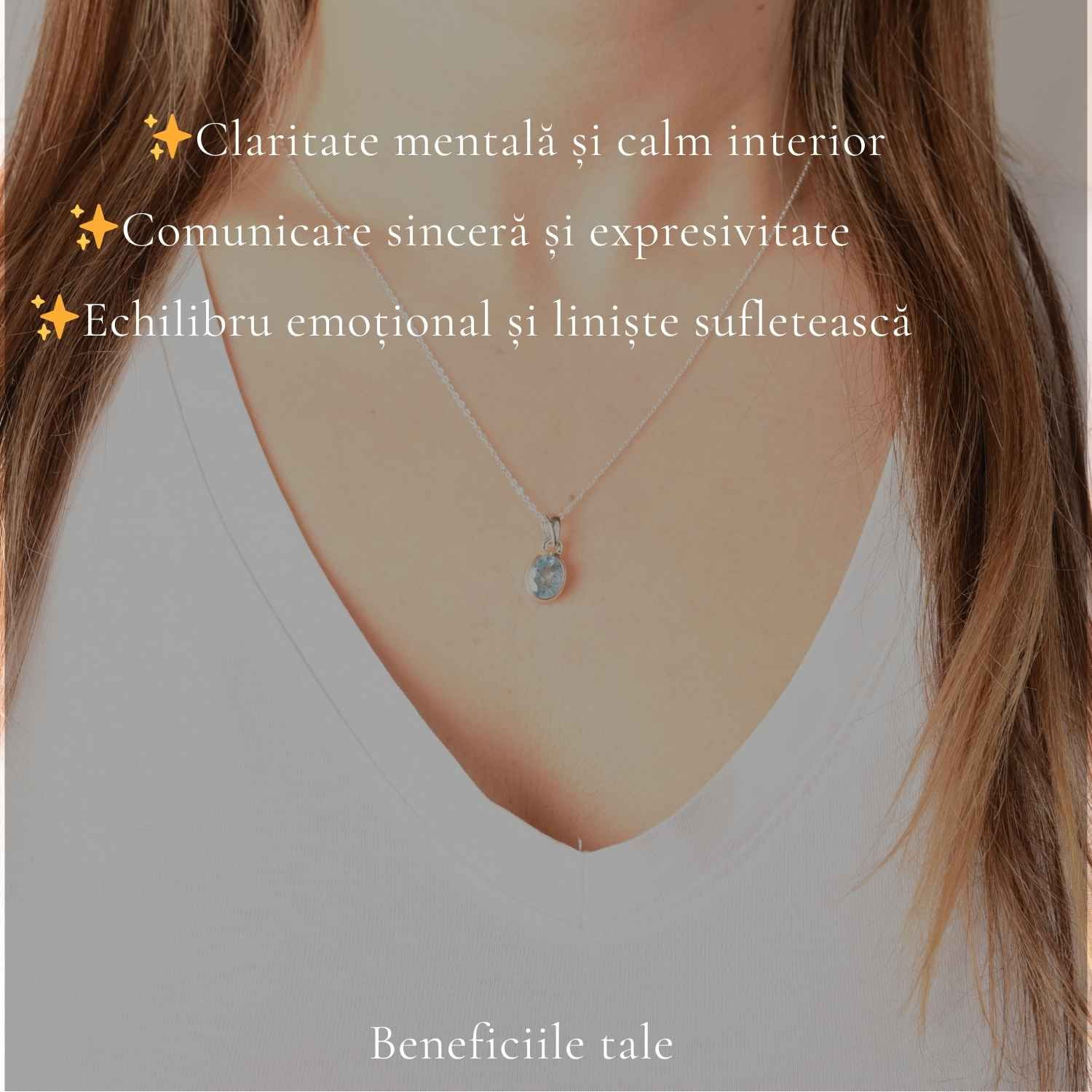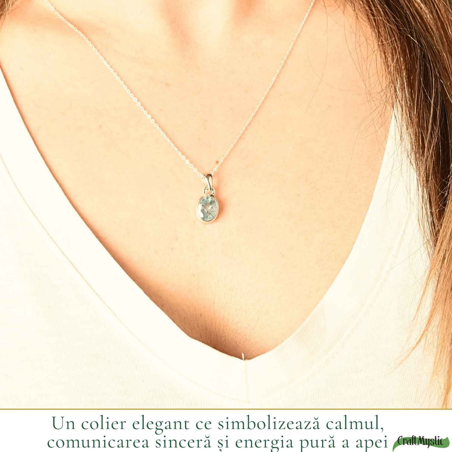 Acvamarinul are acea lumină delicată care îți amintește de apa limpede a oceanului. Este o piatră care aduce liniște, claritate și o energie calmă. Acest colier fin devine ușor o bijuterie pe care o porți zilnic, aproape fără să îți dai seama.