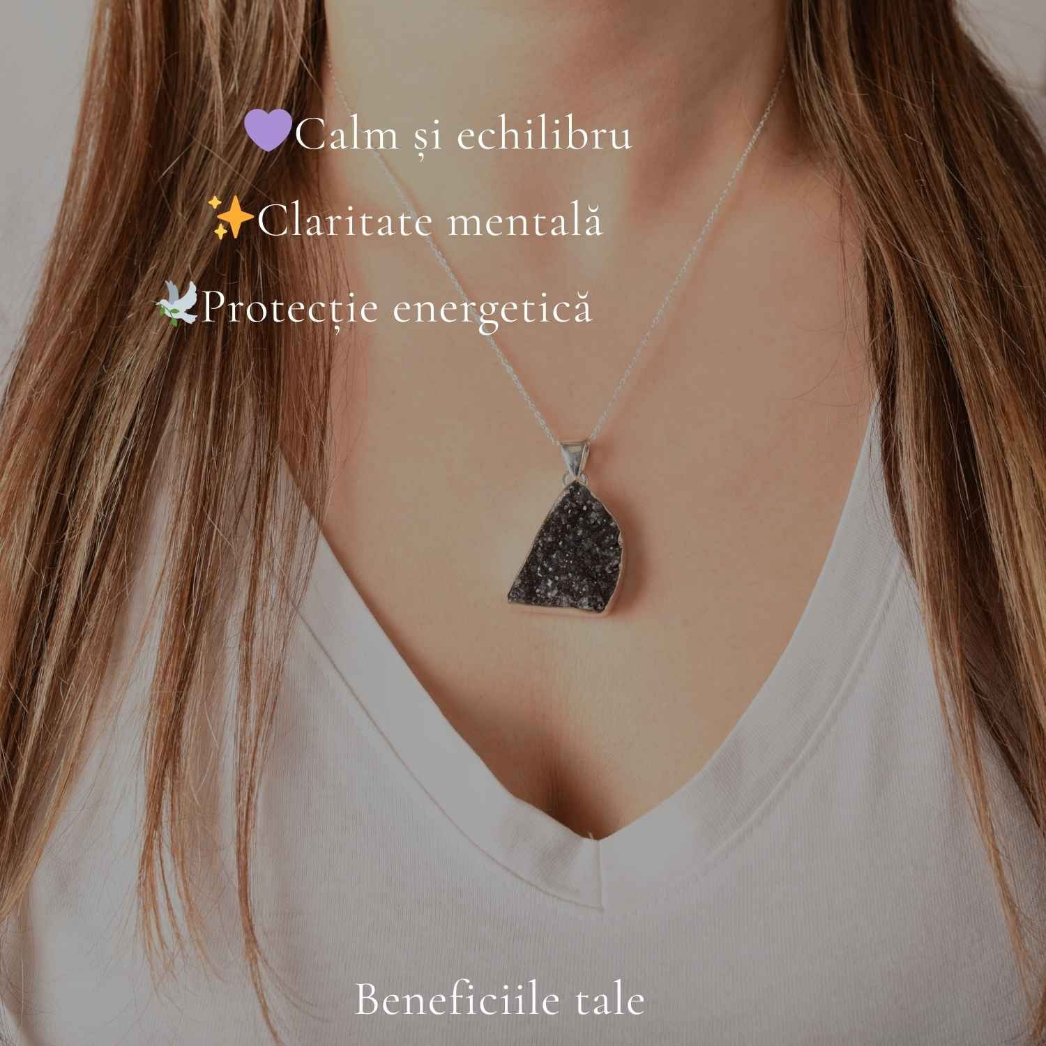 Îți pui colierul dimineața și observi cum micile cristale druzy reflectă lumina în nuanțe violet. Este o bijuterie care atrage privirea fără să fie ostentativă și se potrivește perfect atât cu o ținută casual, cât și cu una elegantă. Colierul are o greutate plăcută, solidă, care îți amintește discret că porți un cristal autentic.