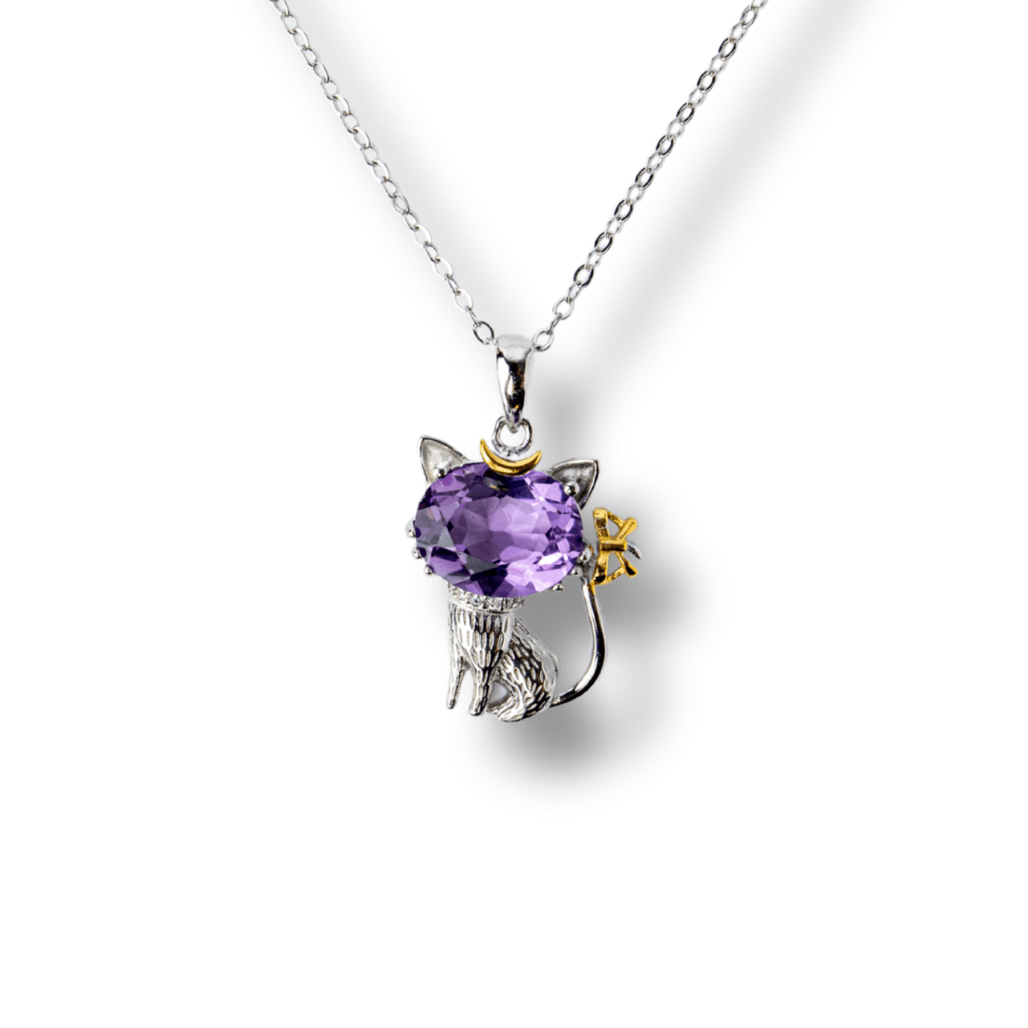 Forma pandantivului îmbină puterea spirituală a ametistului, piatra înțelepciunii și a calmului interior, cu energia protectoare a pisicii, considerată în tradițiile orientale un spirit păzitor al casei și al sufletului.