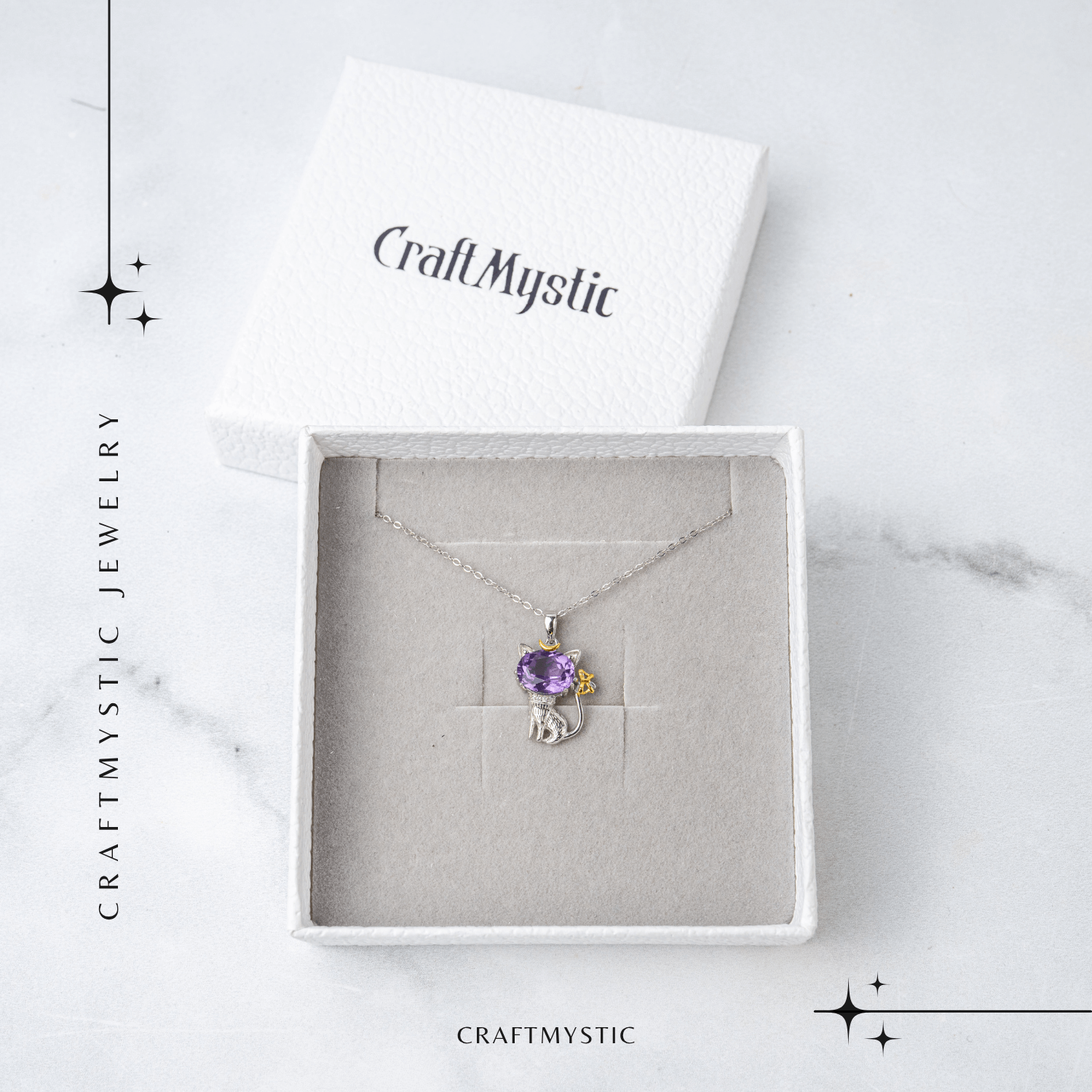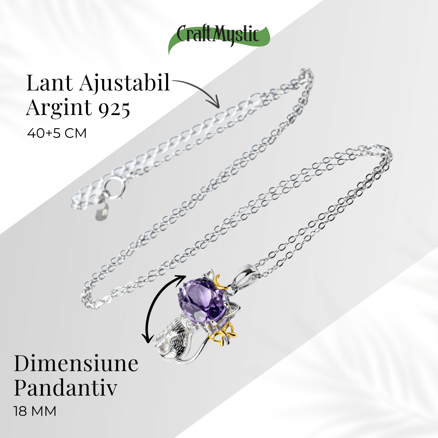 Forma pandantivului îmbină puterea spirituală a ametistului, piatra înțelepciunii și a calmului interior, cu energia protectoare a pisicii, considerată în tradițiile orientale un spirit păzitor al casei și al sufletului.