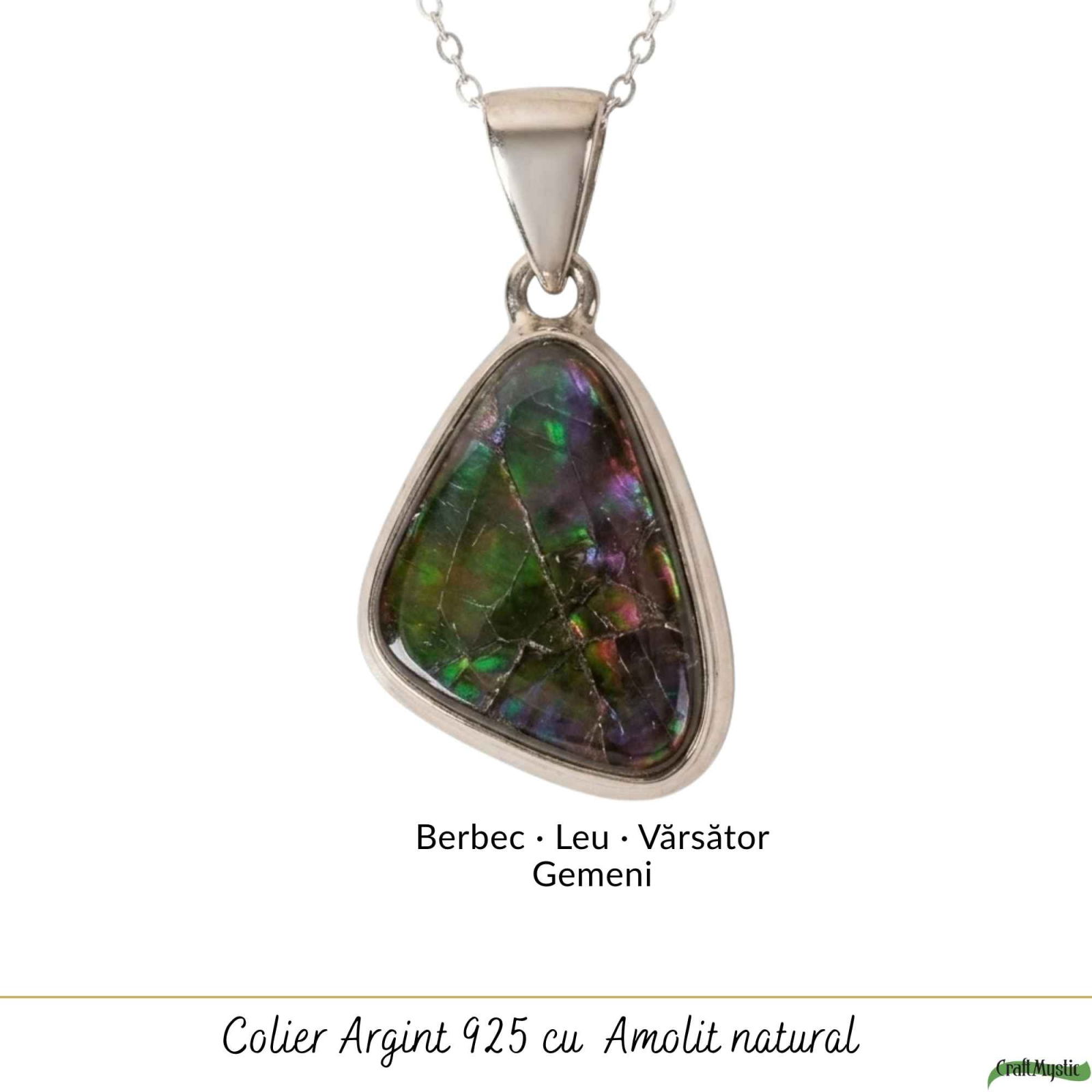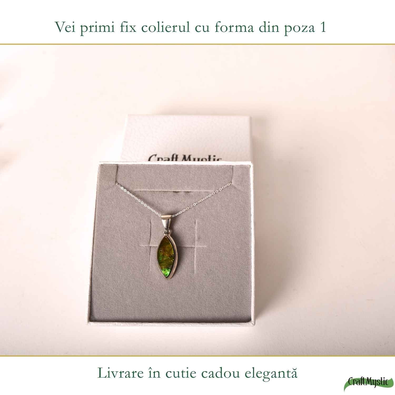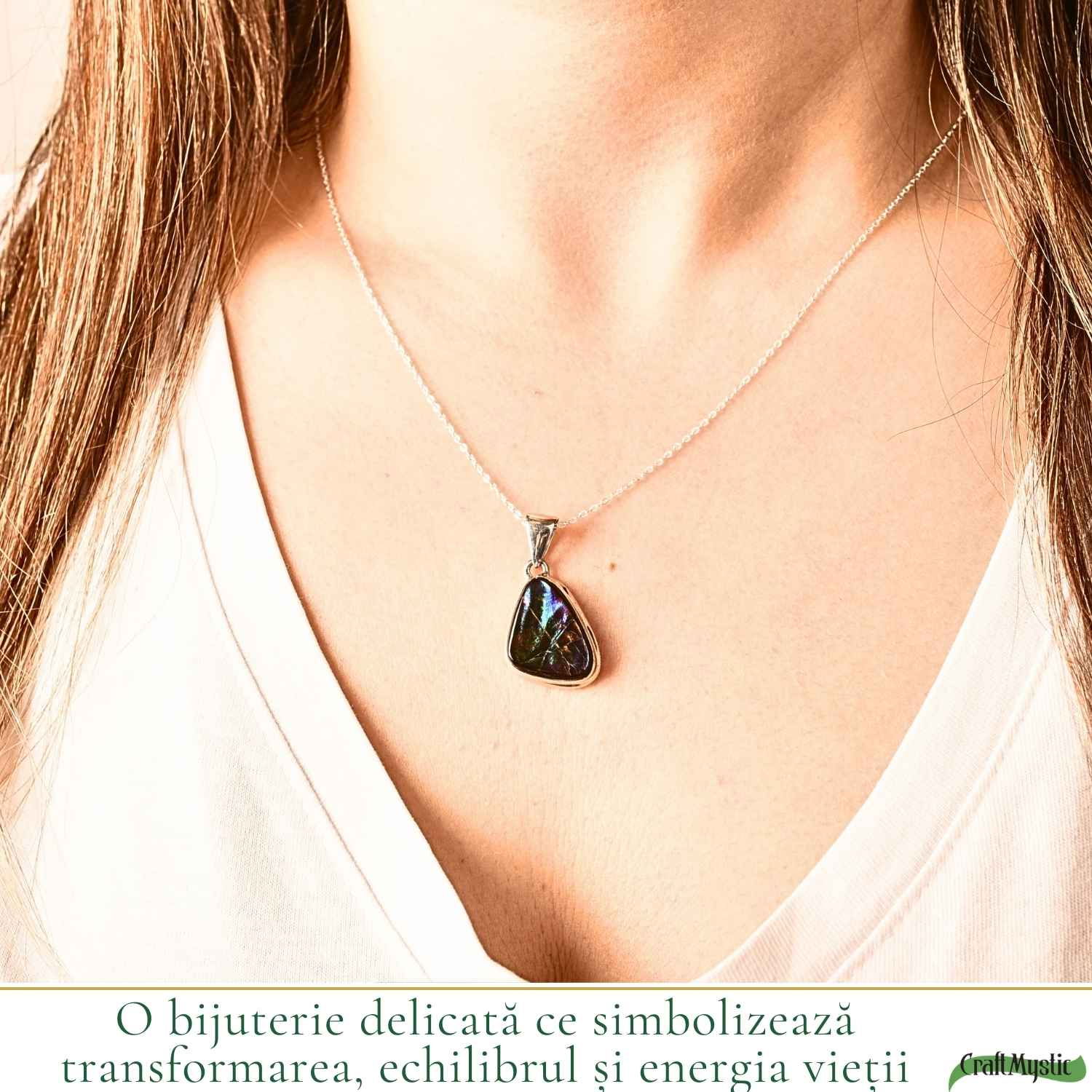 Îți pui colierul dimineața și observi imediat reflexiile fascinante ale amolitului în lumină. Culorile sale irizante atrag discret privirea și oferă colierului un aer special. Este solid și plăcut pe piele, simți că porți o bijuterie autentică.