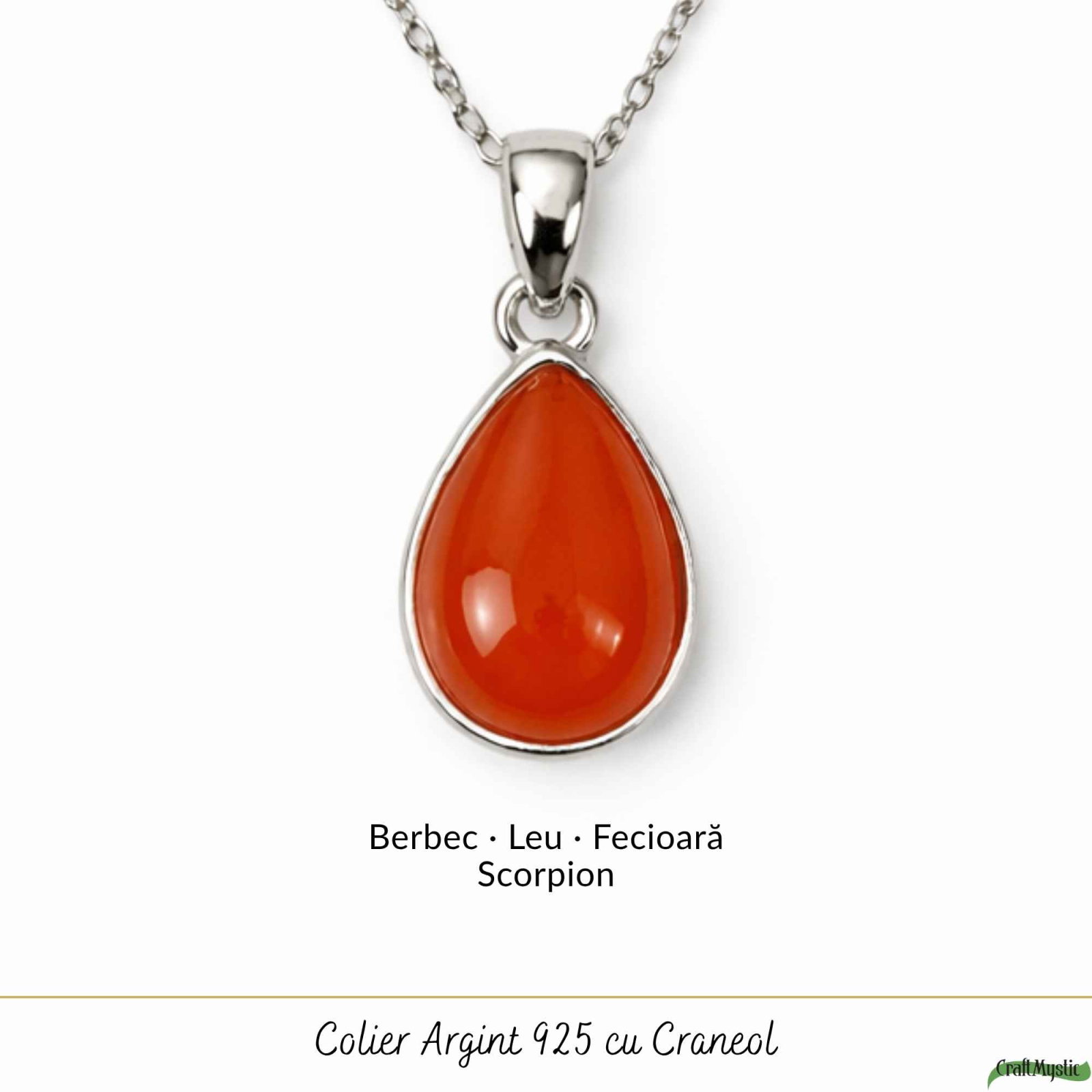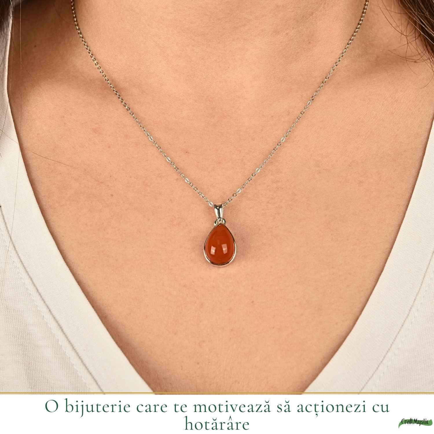 Colier din argint 925 cu Carneol natural în formă de lacrimă – simbol al energiei și transformării. Ușor și delicat, îl porți ca să te simți încrezătoare și conectată la tine.
