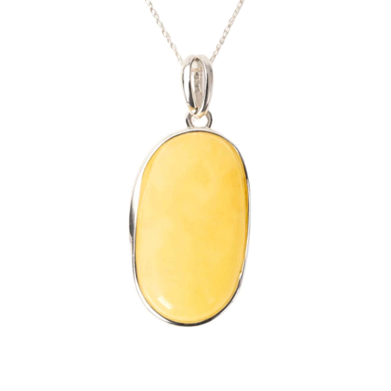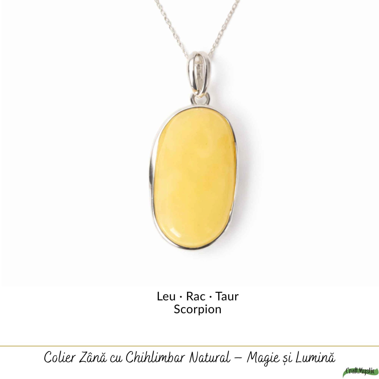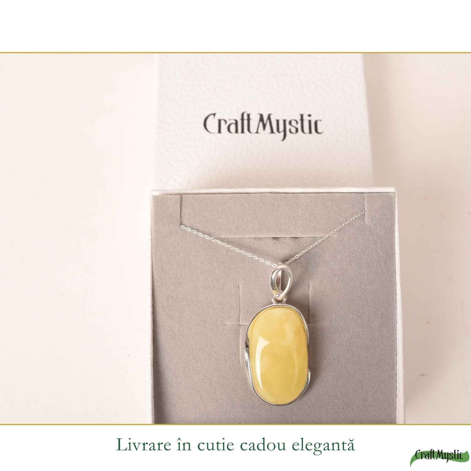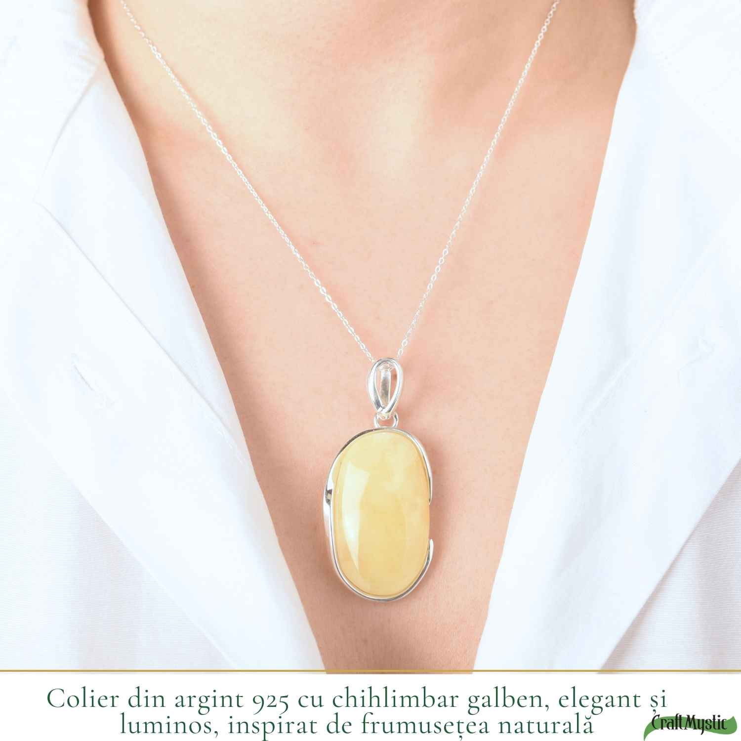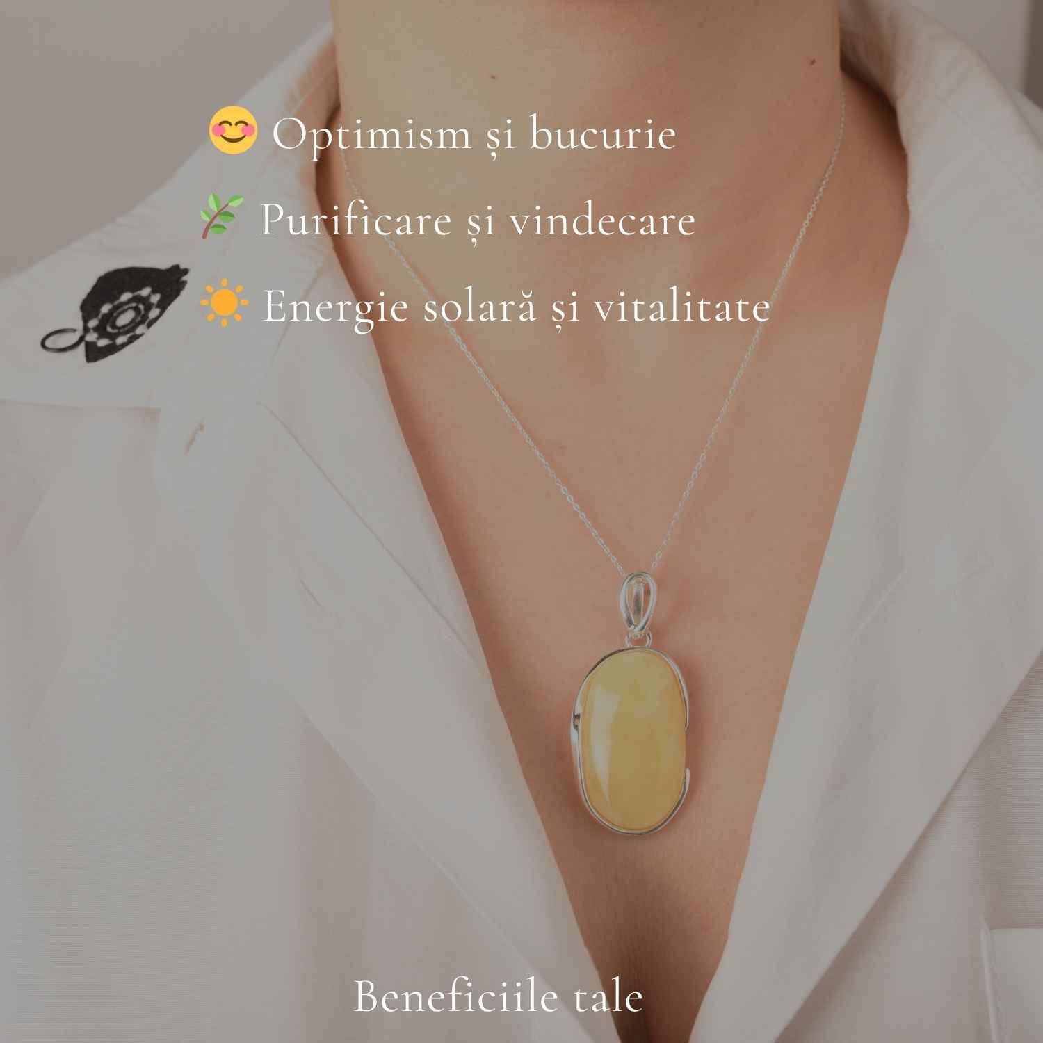Îți imaginezi o rochie simplă sau o cămașă elegantă, iar pandantivul cu chihlimbar galben captează lumina și atrage priviri.