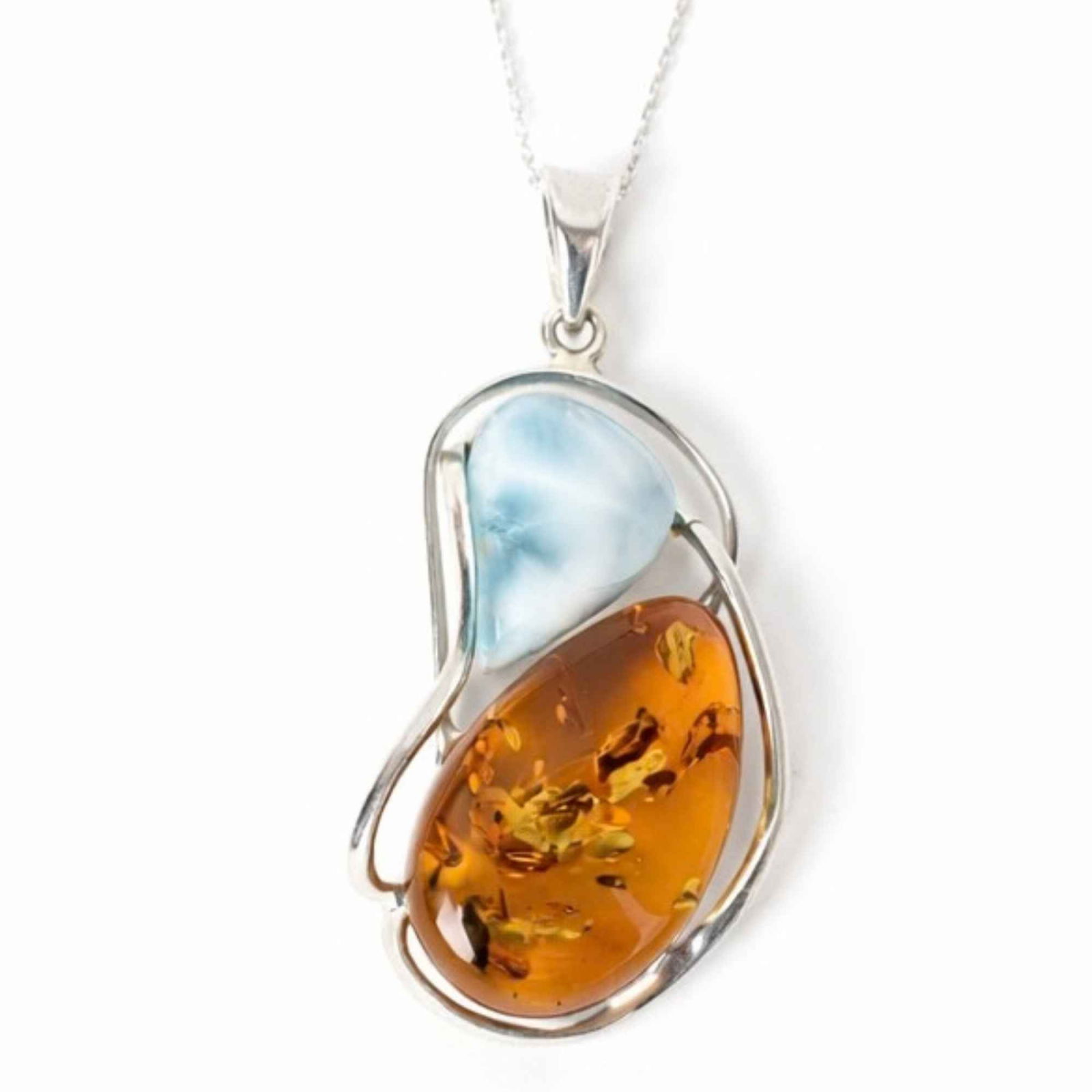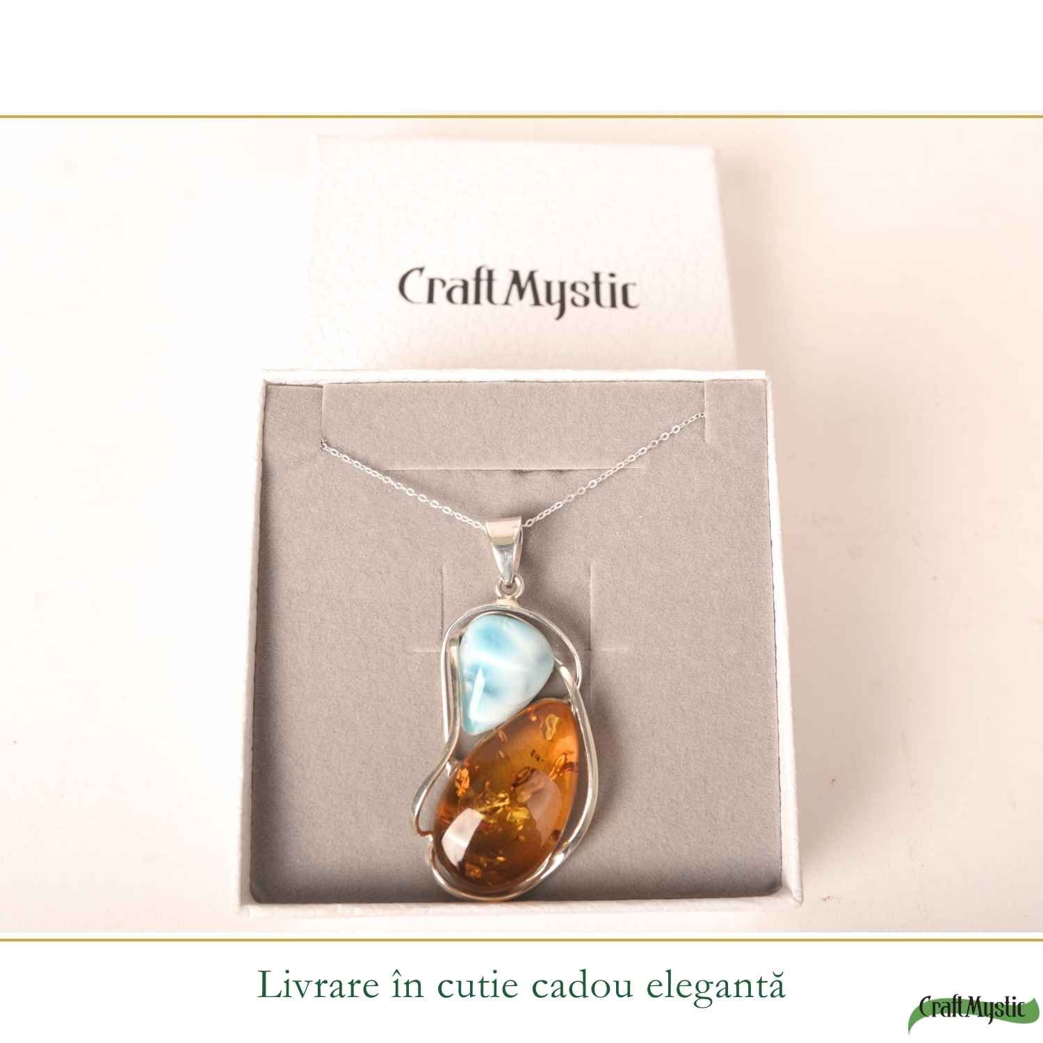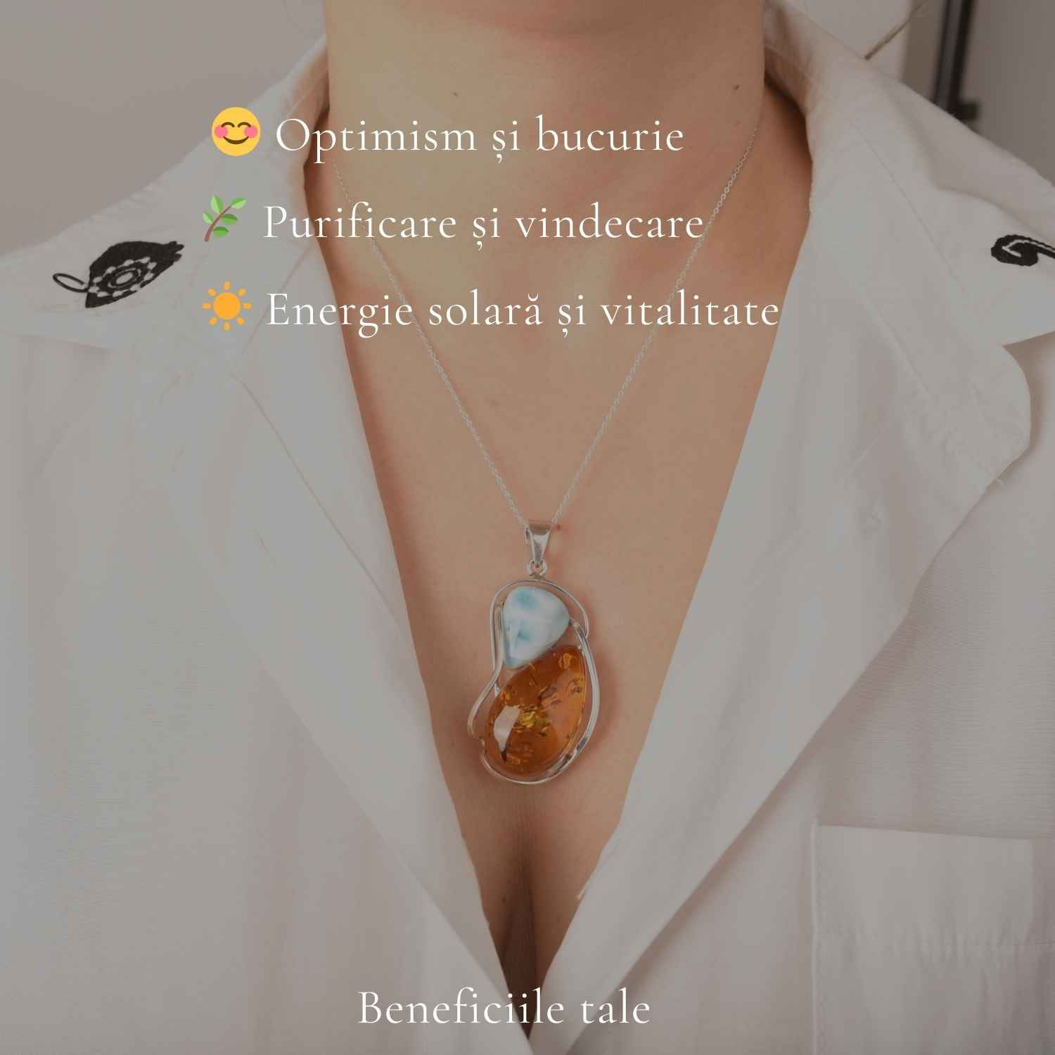 Colier elegant din argint 925 cu pandantiv din chihlimbar natural și larimar, o combinație rară care aduce împreună energia caldă a soarelui și liniștea oceanului. O bijuterie statement, feminină și plină de farmec natural. ✨