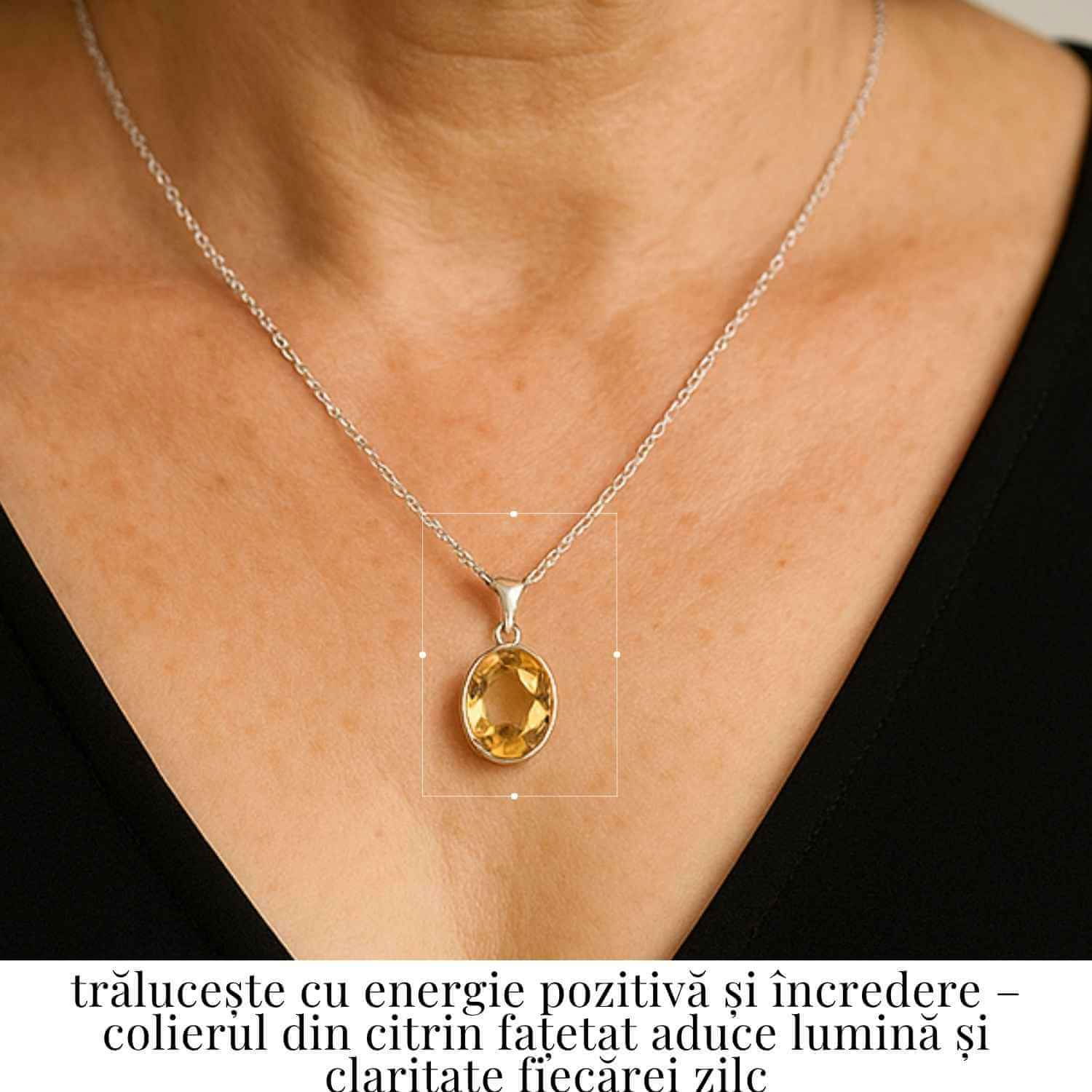 Acest colier delicat din argint 925 cu piatra naturala de Citrin aduce o energie calda, solara, ce trezeste optimismul si bucuria de a trai. Pandantivul in forma ovala simbolizeaza echilibrul si armonia interioara – un flux continuu intre minte, trup si suflet. Citrinul, piatra soarelui interior, lumineaza calea celor care isi doresc curaj, incredere si succes in tot ceea ce intreprind.