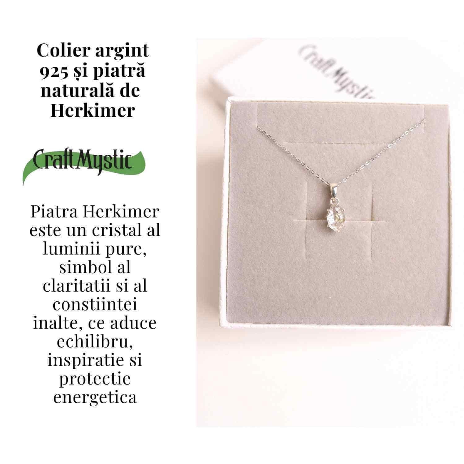 Acest colier din argint 925 cu cristal Herkimer natural este un talisman al claritatii si al trezirii spirituale. Forma sa naturala, cu dubla terminatie, simbolizeaza echilibrul dintre lumina si pamant, dintre energia interioara si cea universala. Piatra Herkimer, adesea numita “diamantul visatorului”, amplifica vibratiile pozitive si deschide calea catre constiinta superioara si puritate interioara.