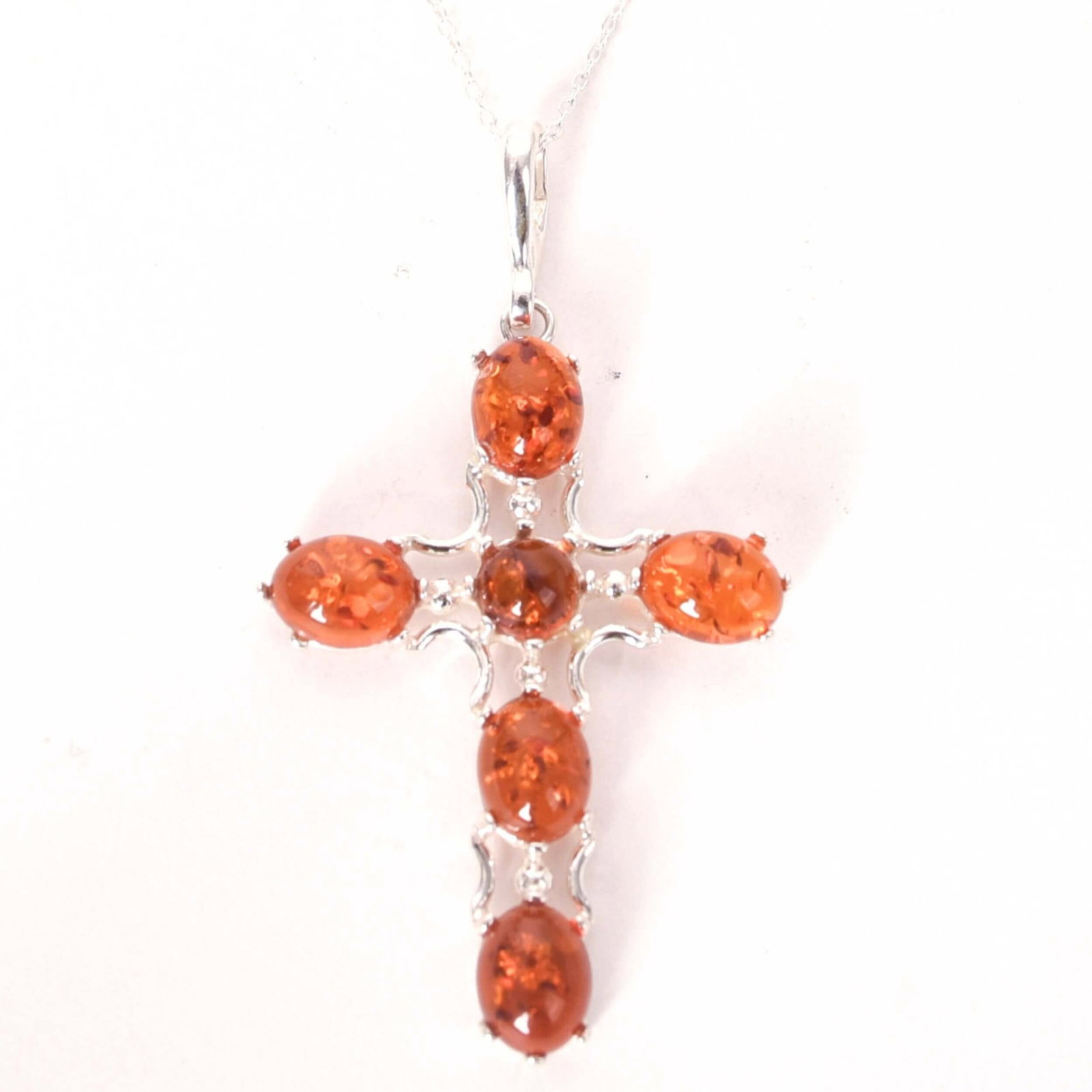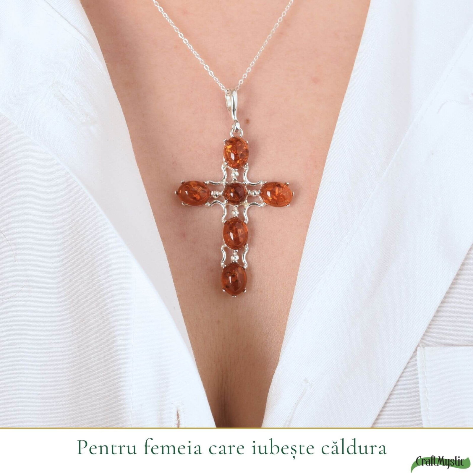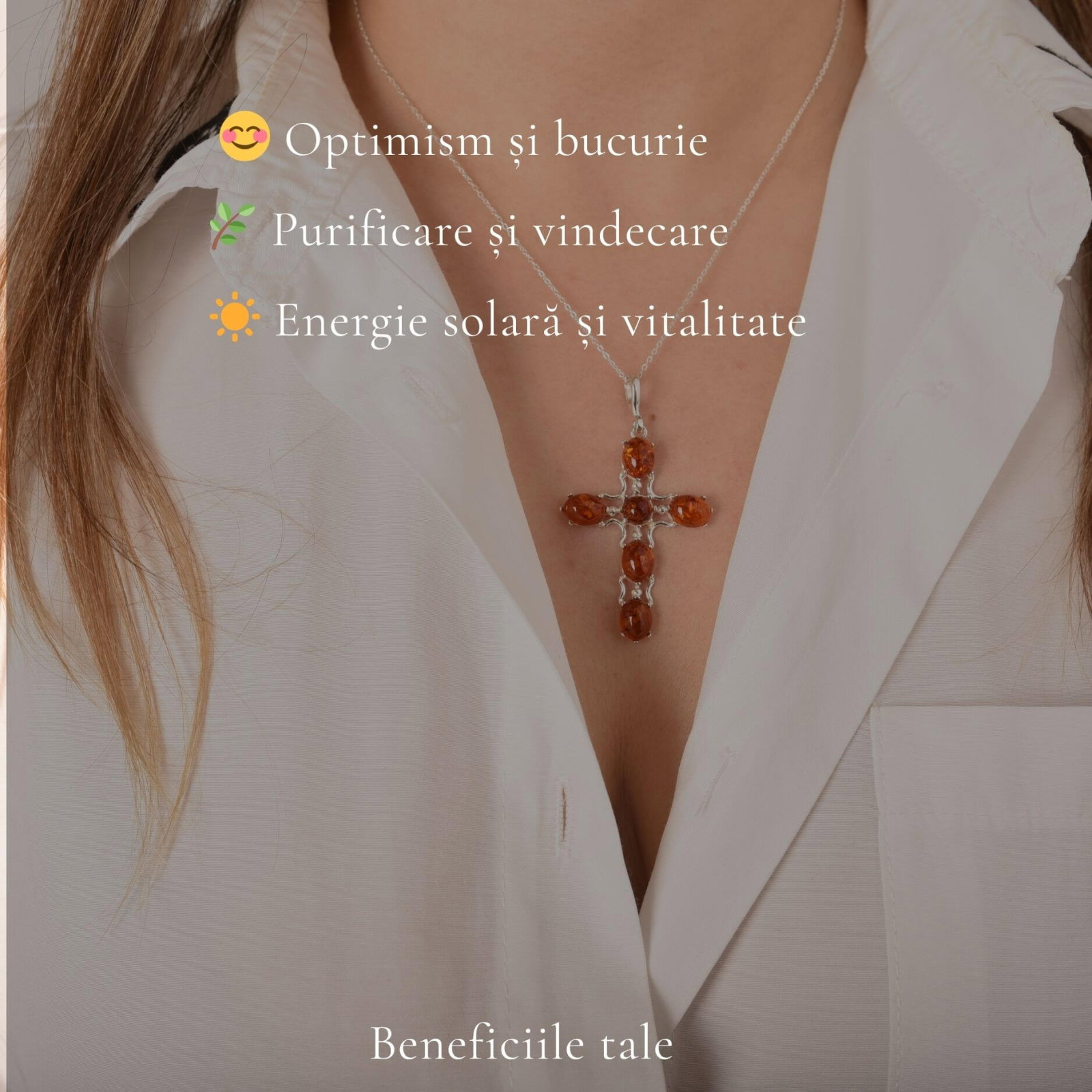 Crucea din mărgele ovale cu chihlimbar natural este o îmbinare între credință și lumină, între protecție și energie solară.