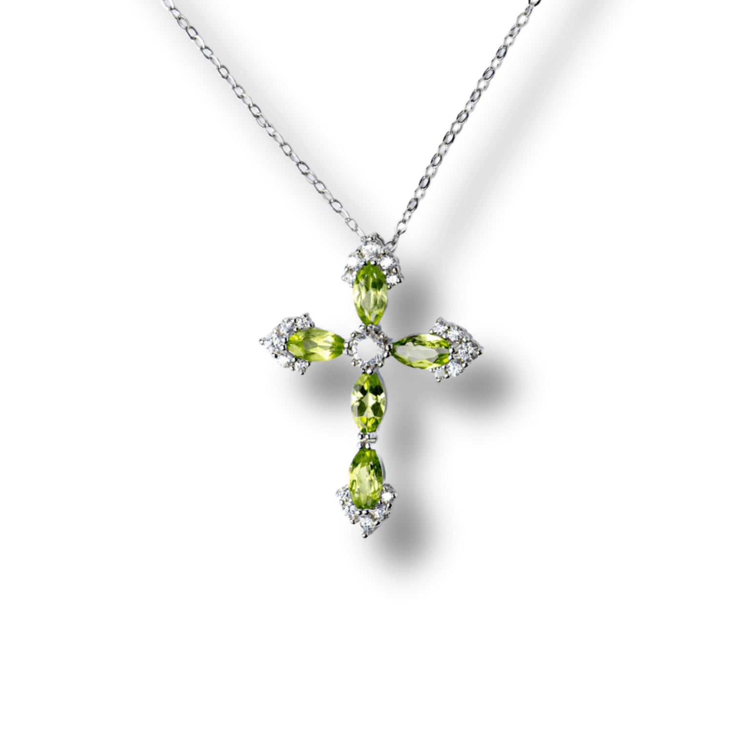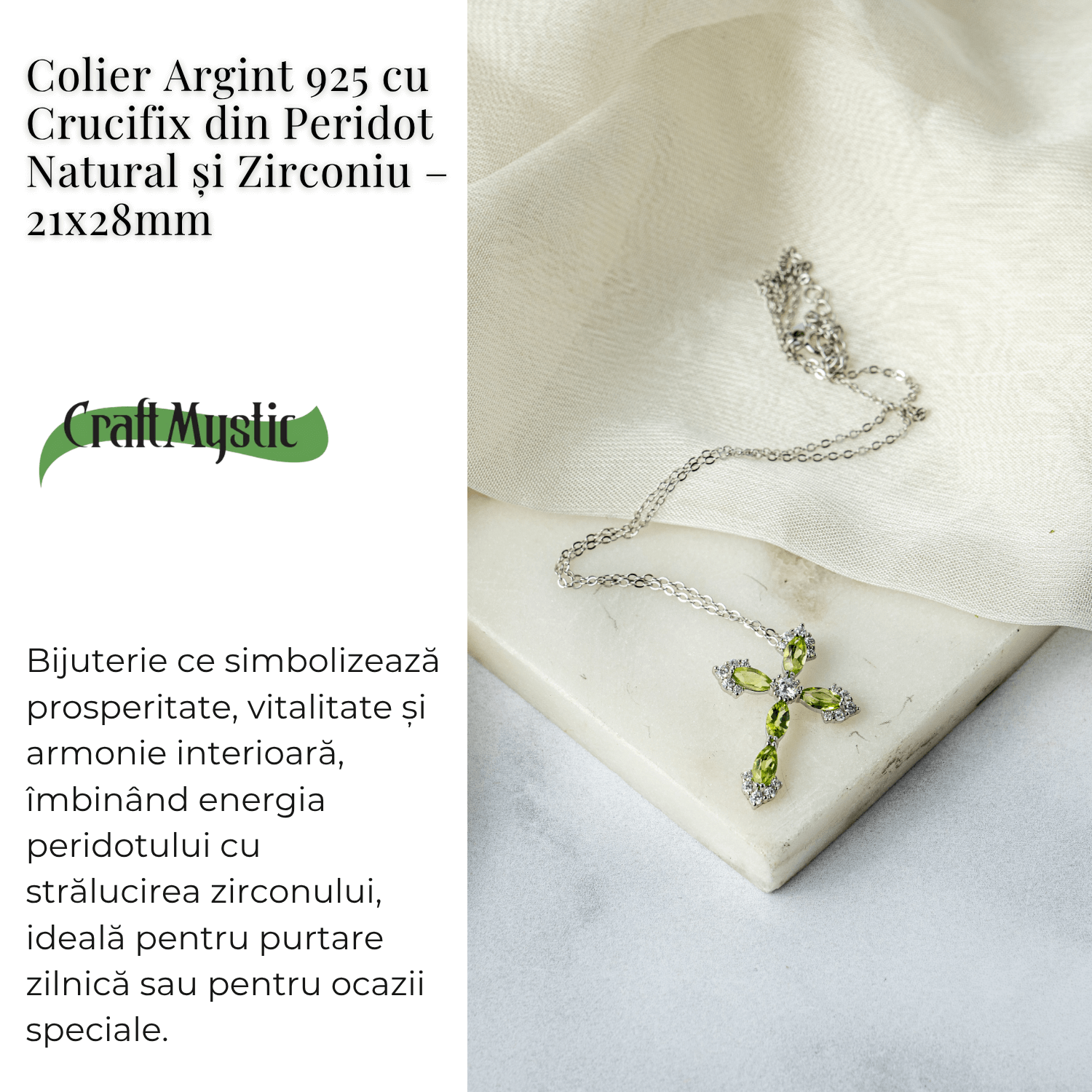 Acest colier rafinat din Argint 925 poartă în centrul său un crucifix strălucitor din Peridot natural și zirconiu, un simbol puternic al credinței, regenerării și protecției divine.