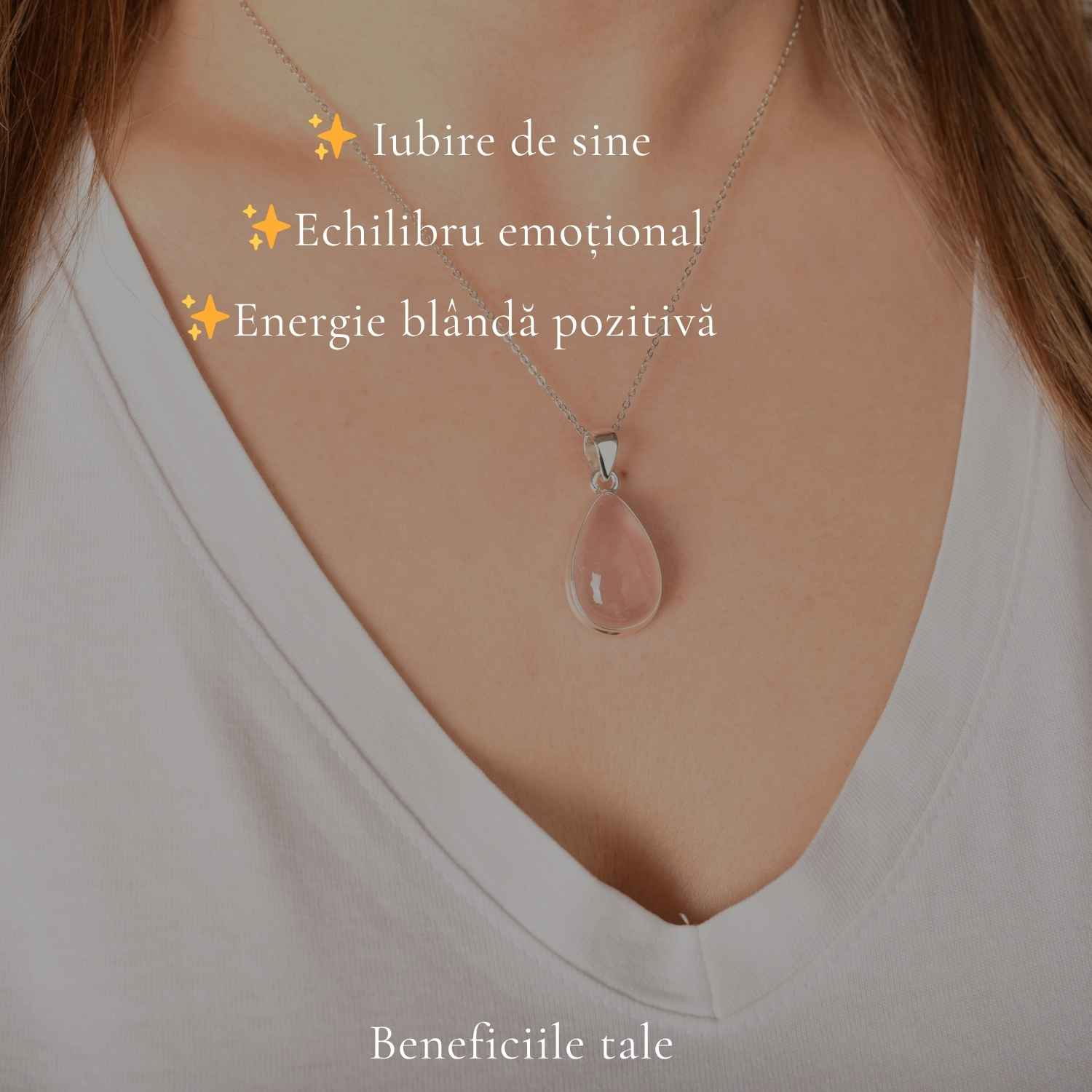 Colierul în formă de lacrimă cu Cuart Roz este despre acele trăiri profunde, transformate în blândețe și iubire.