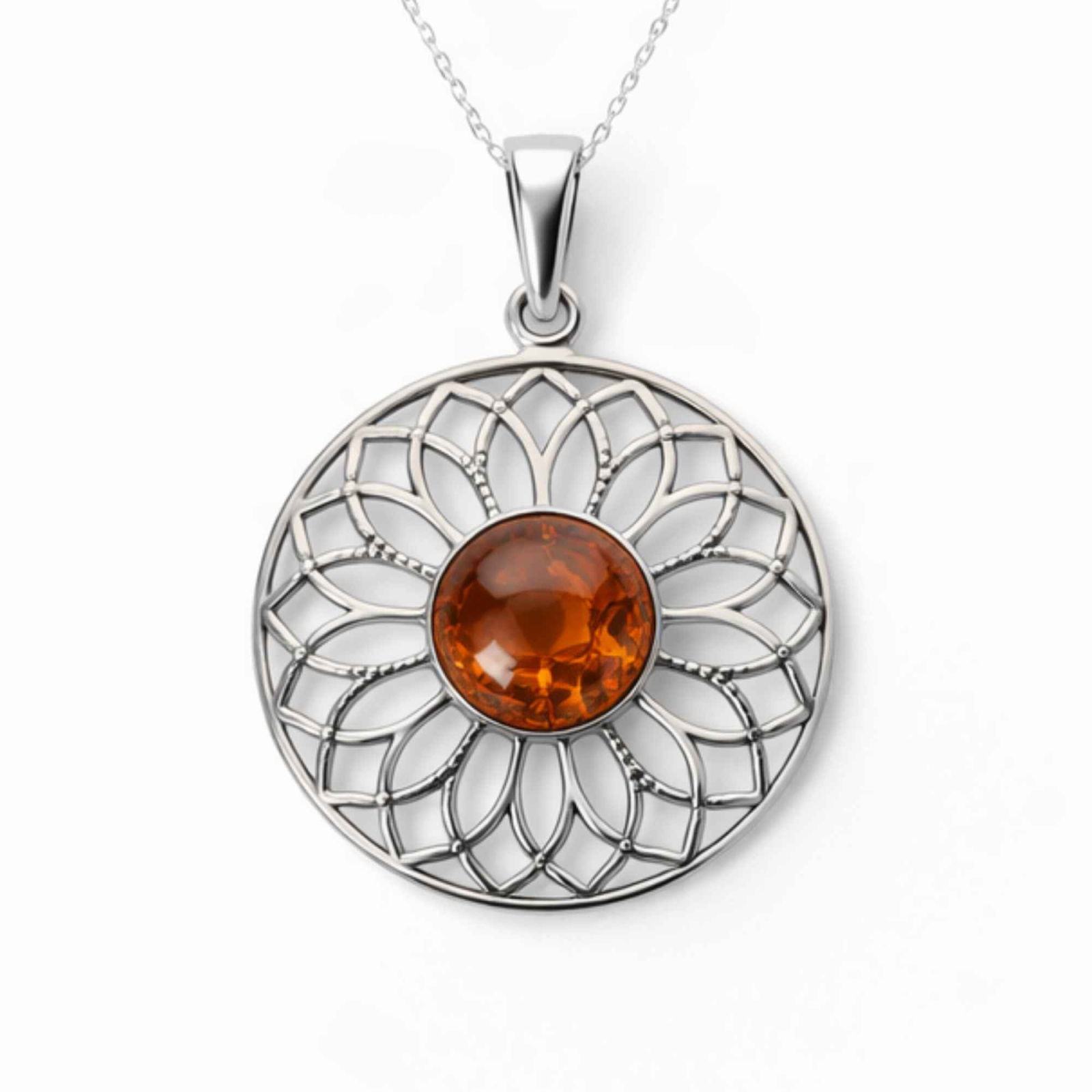 Acest colier cu floare mare din chihlimbar natural aduce lumina soarelui și frumusețea naturii într-o bijuterie feminină care nu trece neobservată.