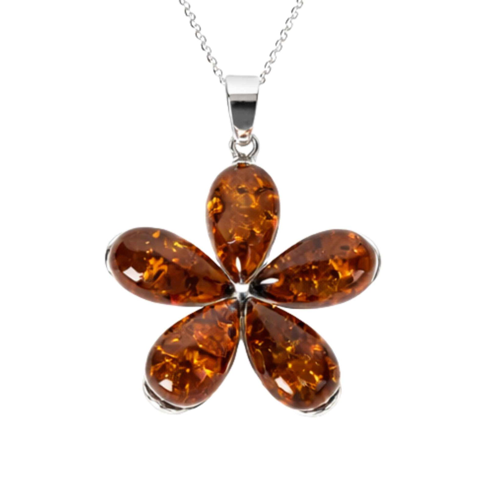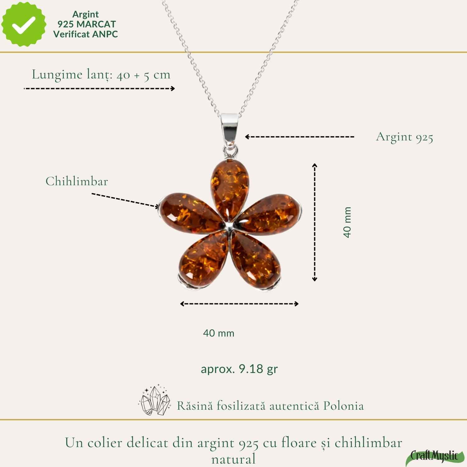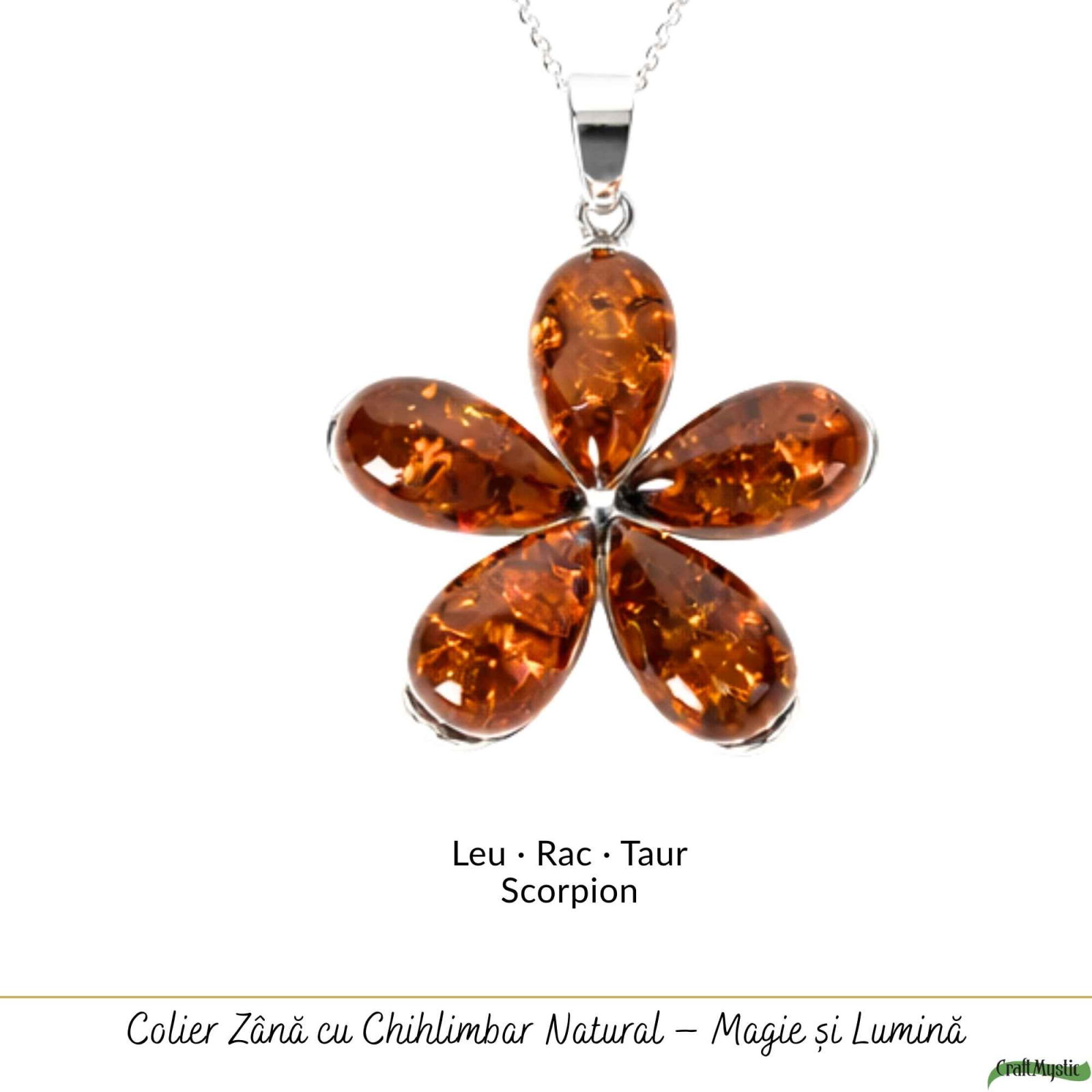 Imaginează-ți o zi în care porți o rochie simplă sau o cămașă elegantă, iar acest pandantiv în formă de floare atrage discret atenția. Lumina se reflectă în chihlimbarul cald, iar colierul devine piesa care îți completează stilul.