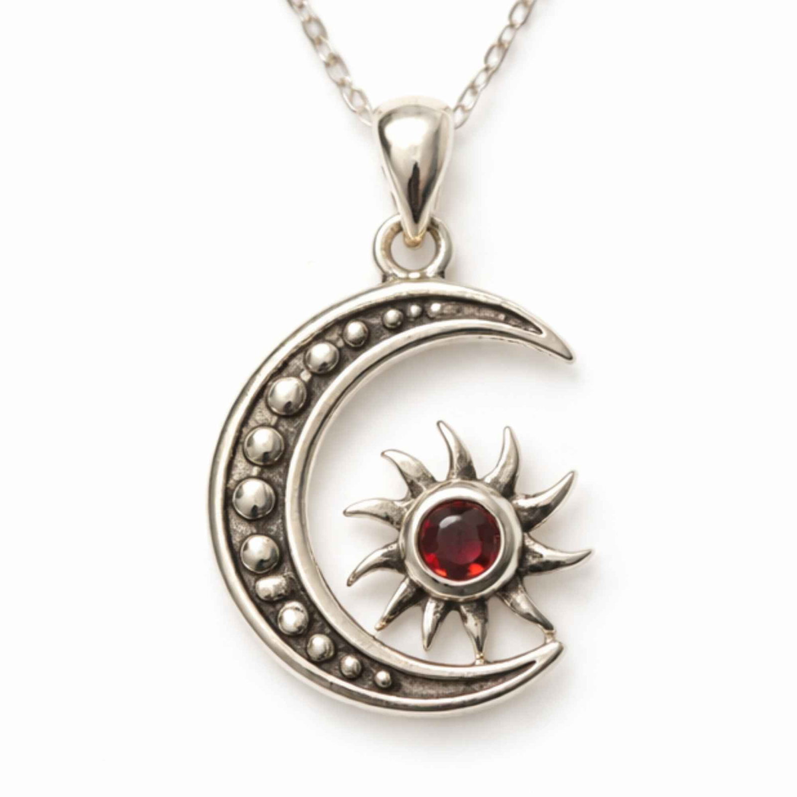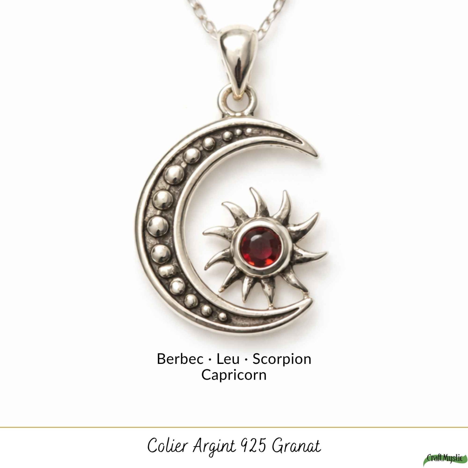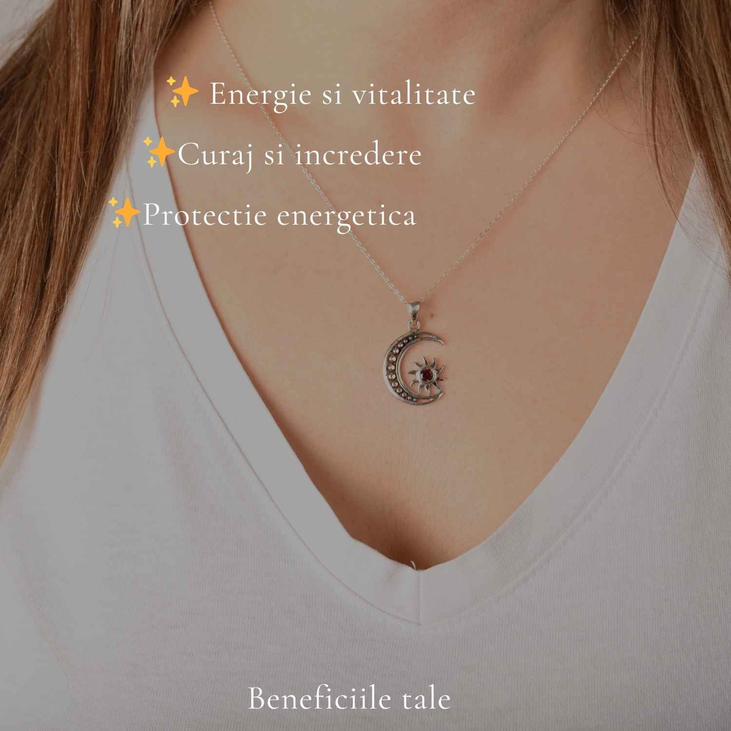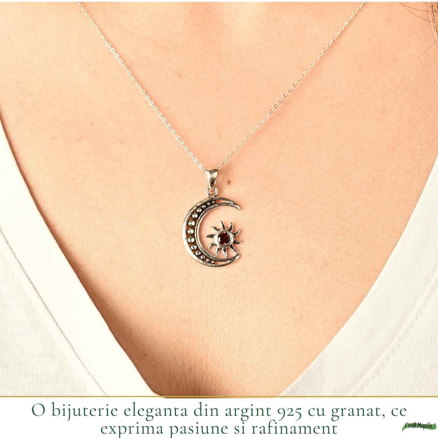 Colier din argint 925 cu granat natural, în simbol soare și lună, ce aduce echilibru între energie și intuiție. Ușor și expresiv, este acel detaliu care îți completează stilul cu sens și profunzime.