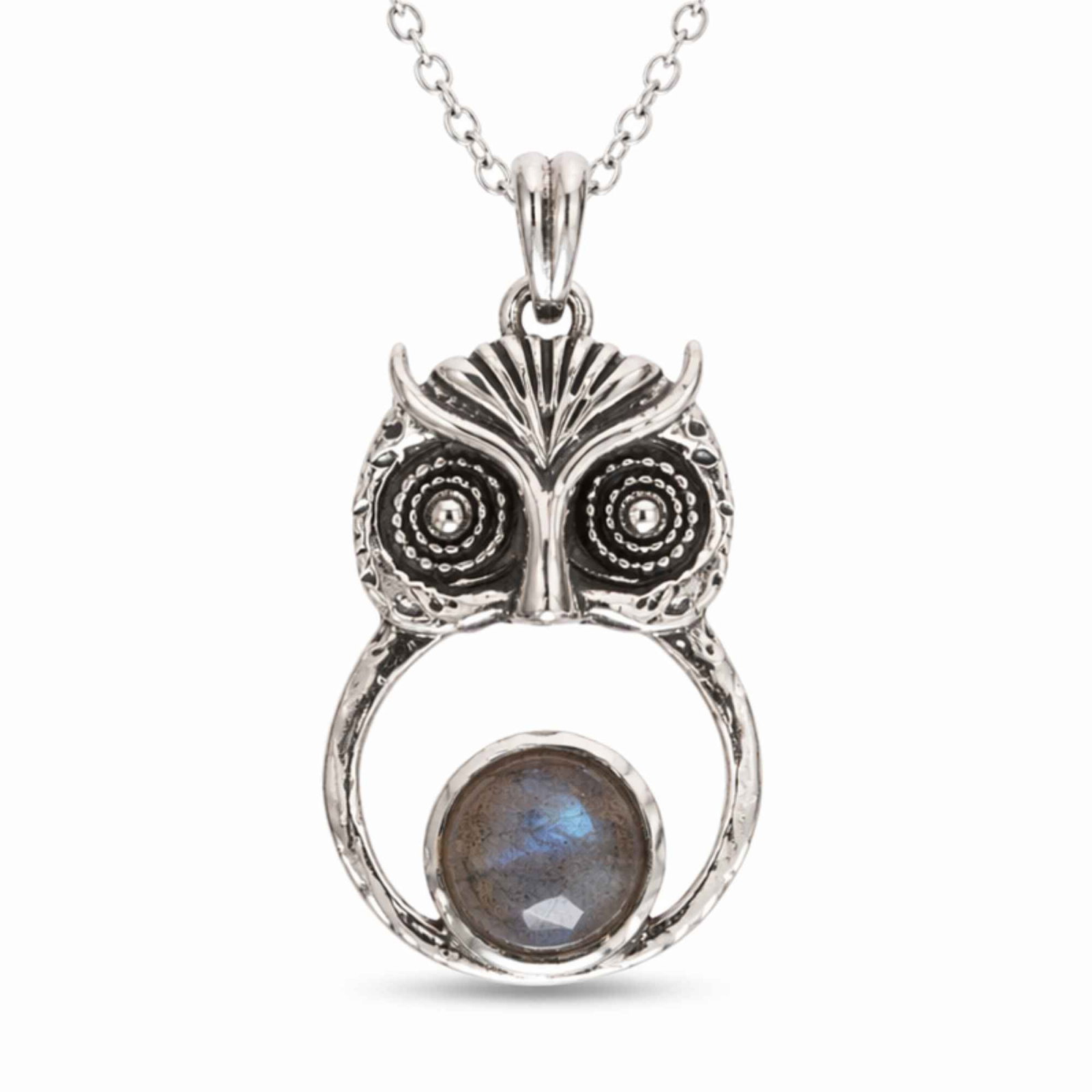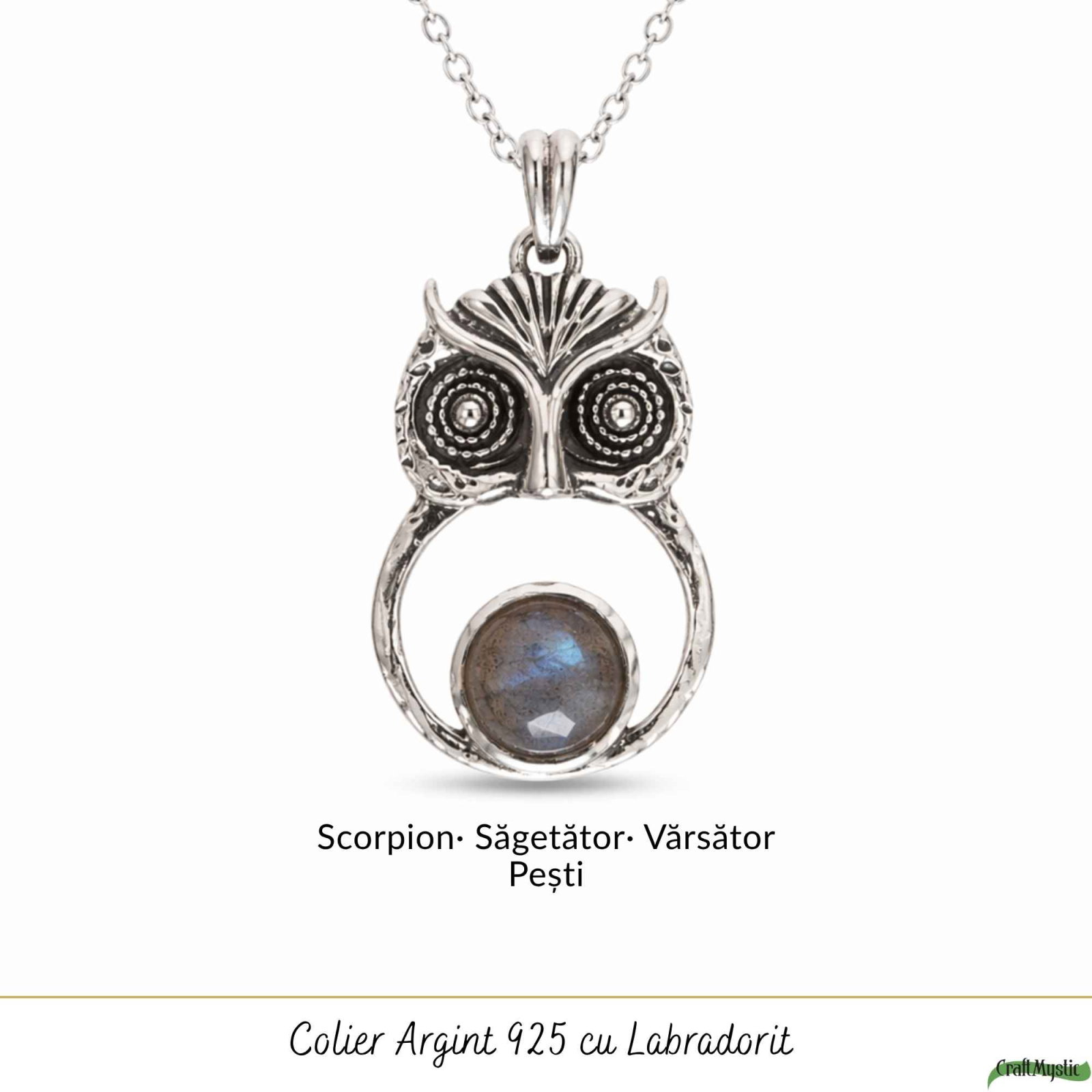 Colier din argint 925 cu labradorit în formă de bufniță, o bijuterie simbolică și elegantă. Îți oferă protecție energetică și îți amplifică intuiția, fiind perfect pentru un stil cu personalitate și sens