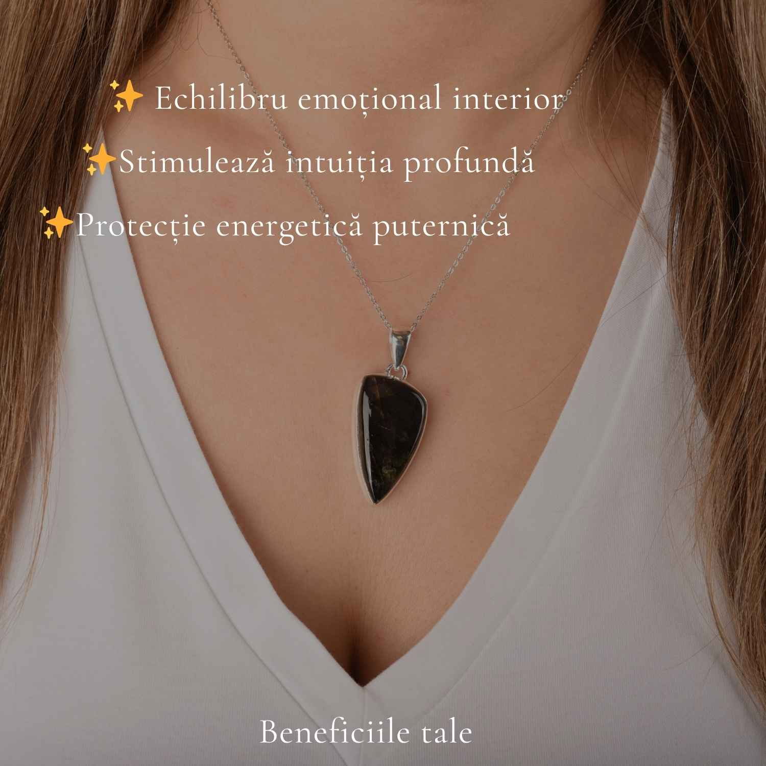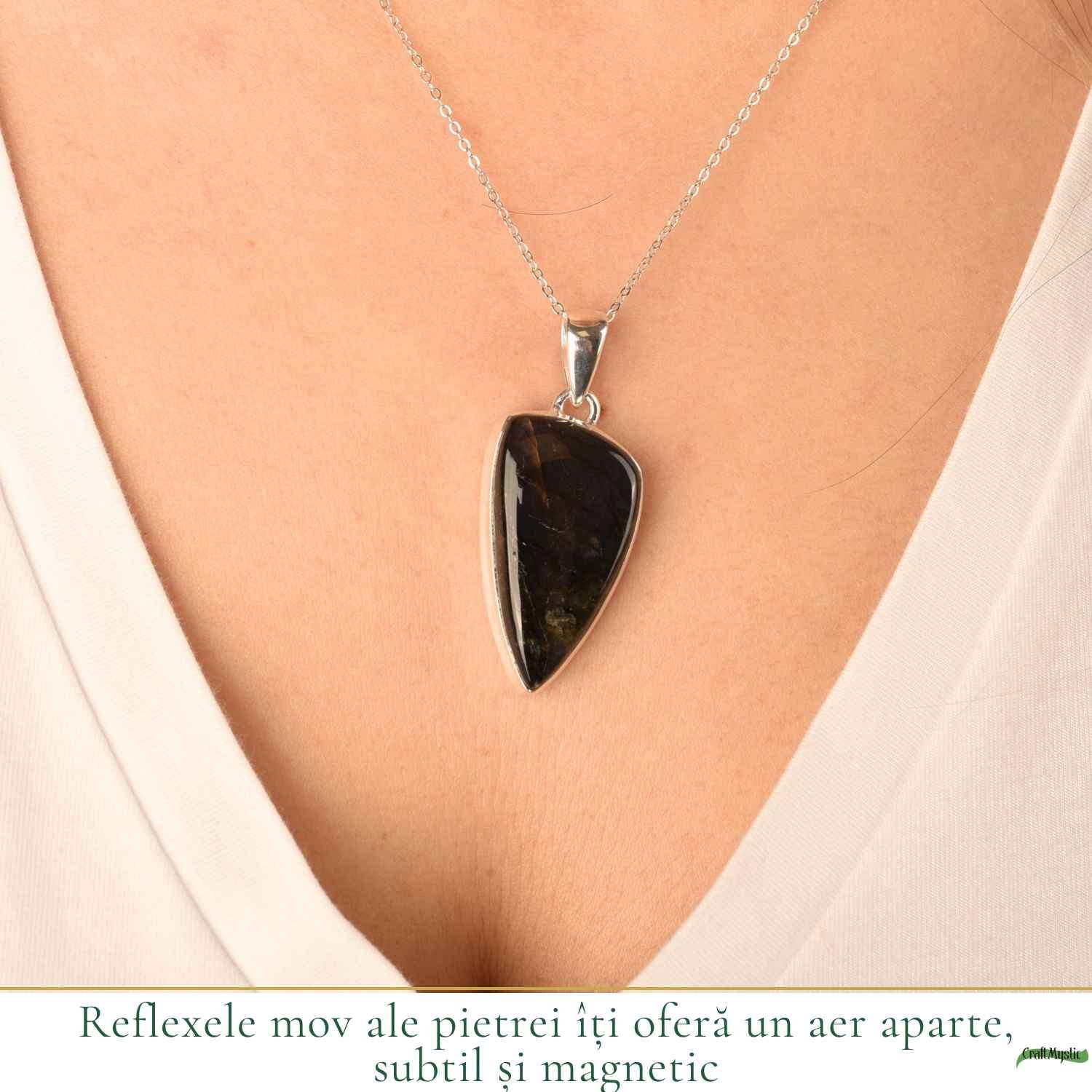 Fiecare colier spune o poveste diferită. Forma neuniformă și reflexele violet ale labradoritului îl transformă într-o bijuterie vie, care te reprezintă exact așa cum ești: autentică și unică.