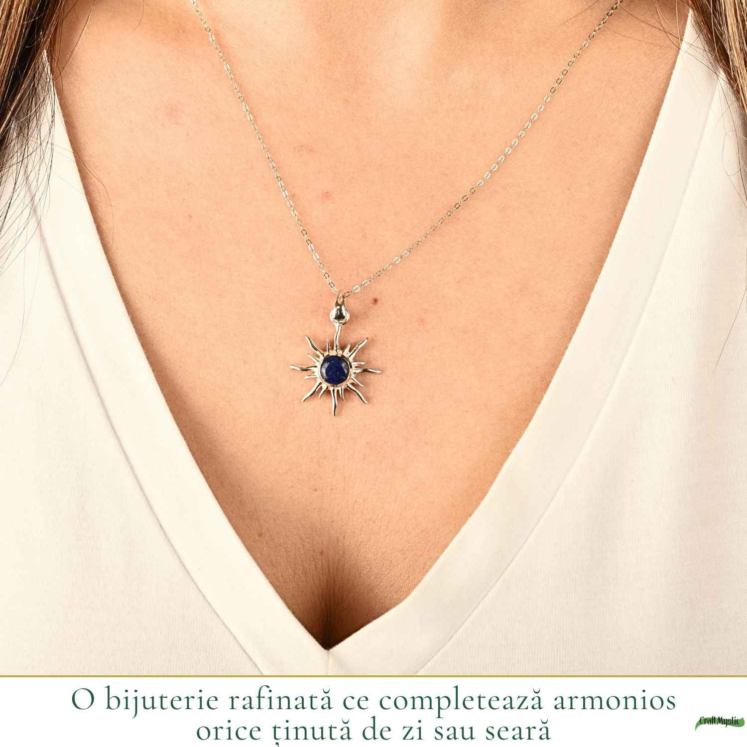 Colierul cu lapis lazuli și simbolul soarelui îți aduce acea energie caldă și claritate interioară pe care o simți imediat.