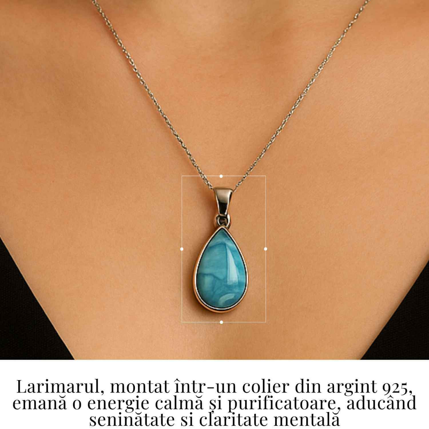 Acest colier delicat din argint 925 cu piatra naturala de Larimar aduce purtatoarei o stare profunda de calm, seninatate si echilibru emotional. Forma de lacrima simbolizeaza eliberarea si curatarea sufletului, amintindu-ne ca vulnerabilitatea este o forta, iar Larimarul, piatra oceanului, ne leaga de energia apei si de pacea interioara.