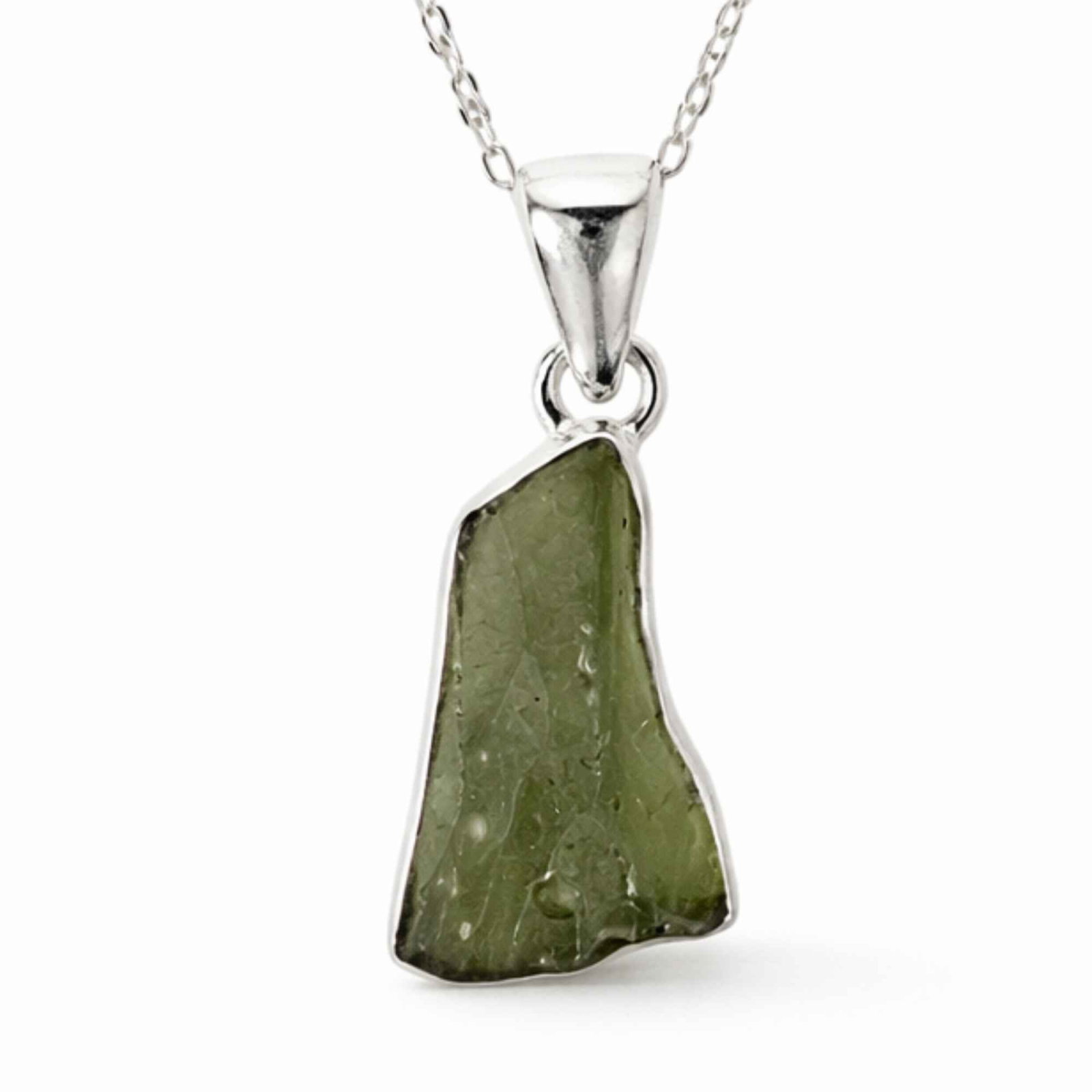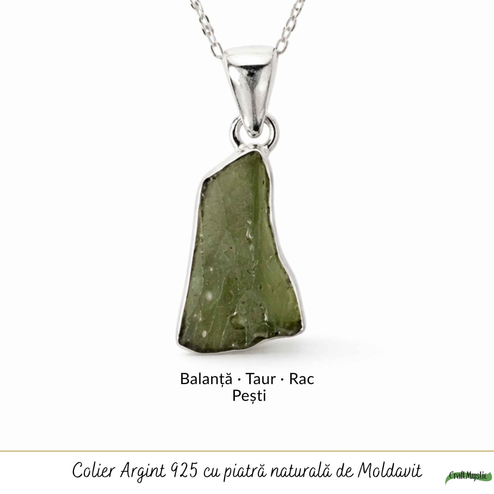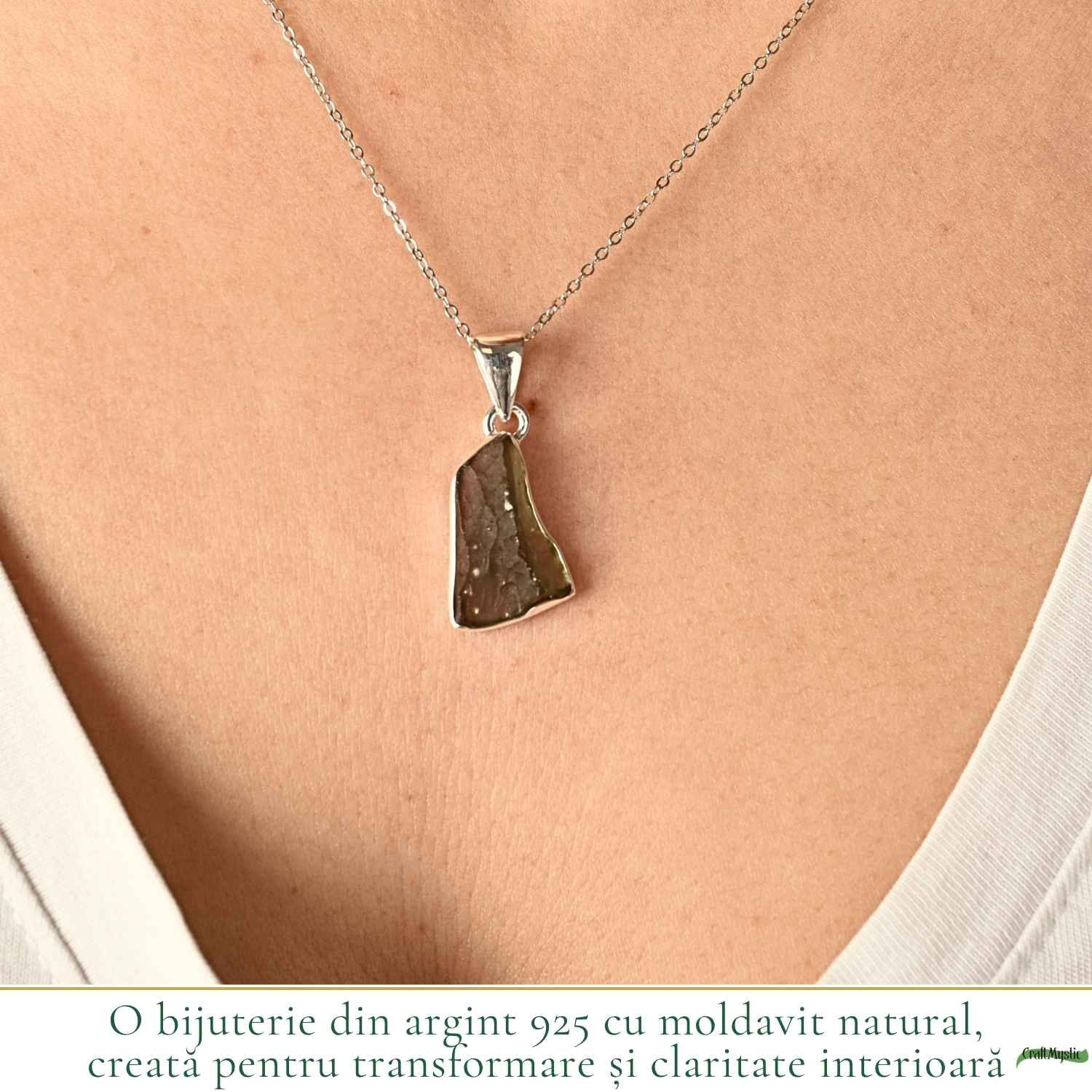 Colier delicat din argint 925 cu moldavit brut, o piatră rară născută din impact cosmic. Cu formă naturală și energie intensă, această bijuterie unică te susține în momentele de transformare și te reconectează cu intuiția ta. Ușor și versatil, îl porți zilnic ca un simbol al evoluției personale.
