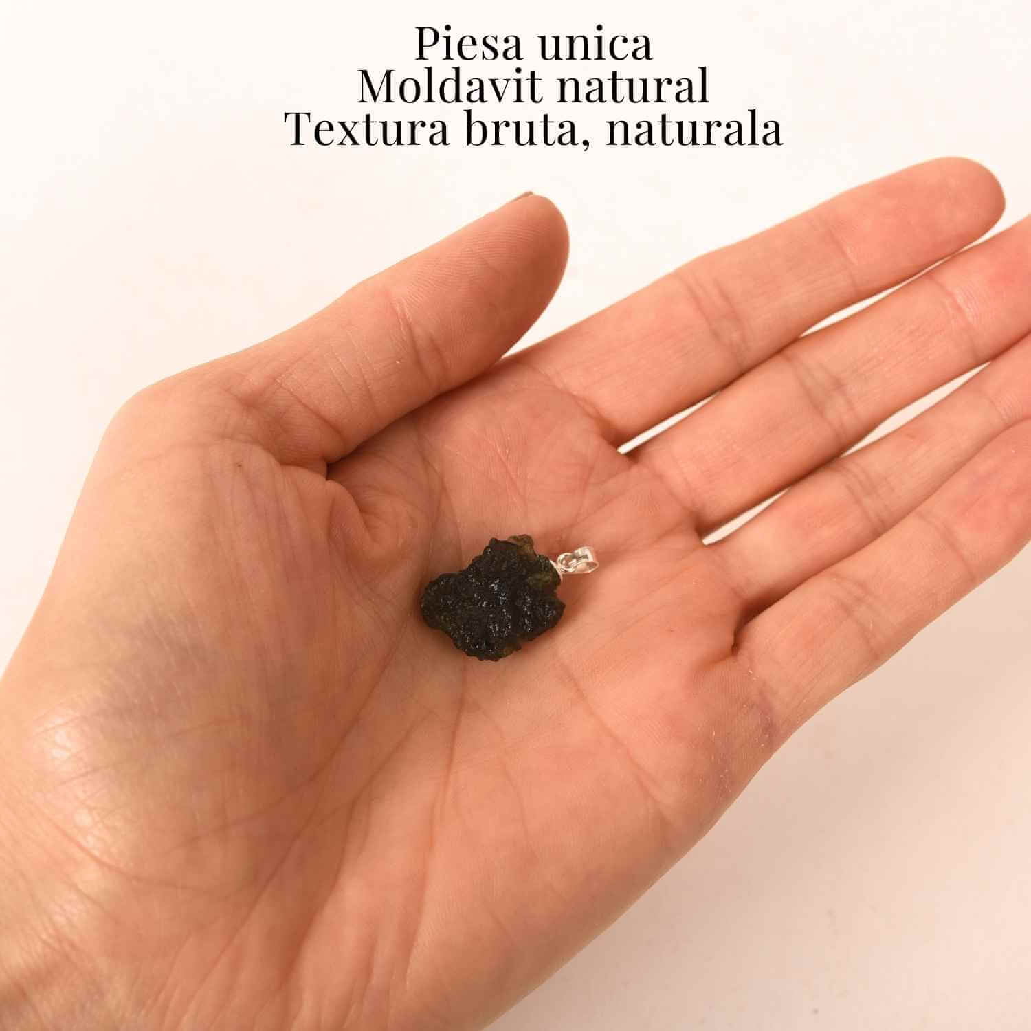 Acest colier din argint 925 evidențiază frumusețea brută și autentică a Moldavitului natural, fiecare piesă fiind diferită, cu textură și formă unică, exact așa cum natura a creat-o.