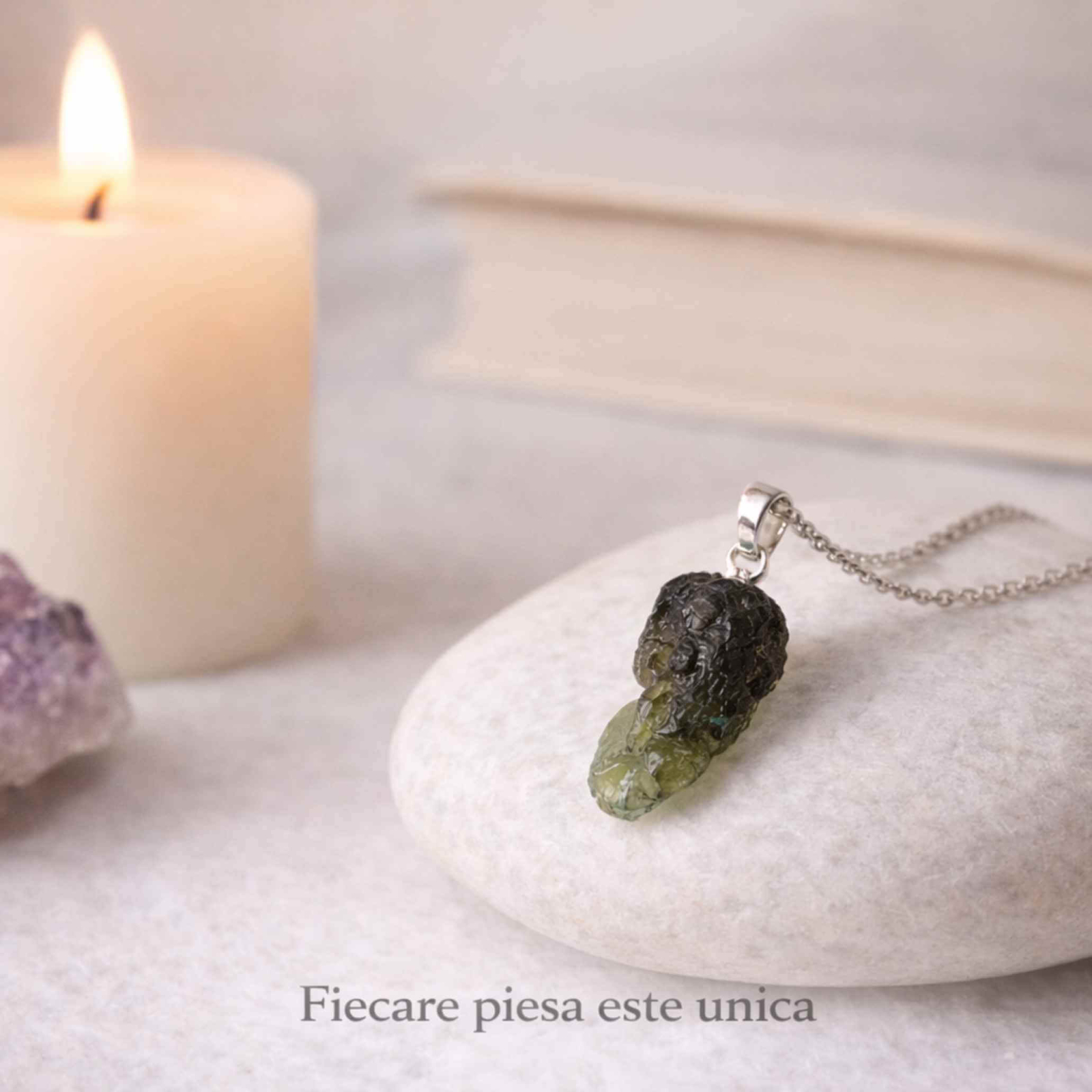 Dacă te afli într-un proces de schimbare – în carieră, relații sau dezvoltare personală – acest colier cu Moldavit natural te susține cu protecție, claritate mentală și curaj.