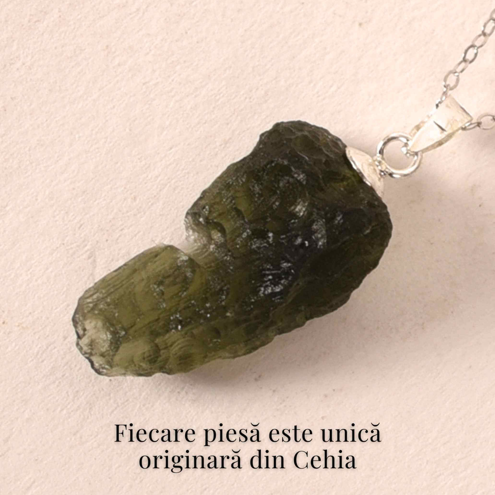 Acest colier din argint 925 evidențiază frumusețea brută și autentică a Moldavitului natural, fiecare piesă fiind diferită, cu textură și formă unică, exact așa cum natura a creat-o.