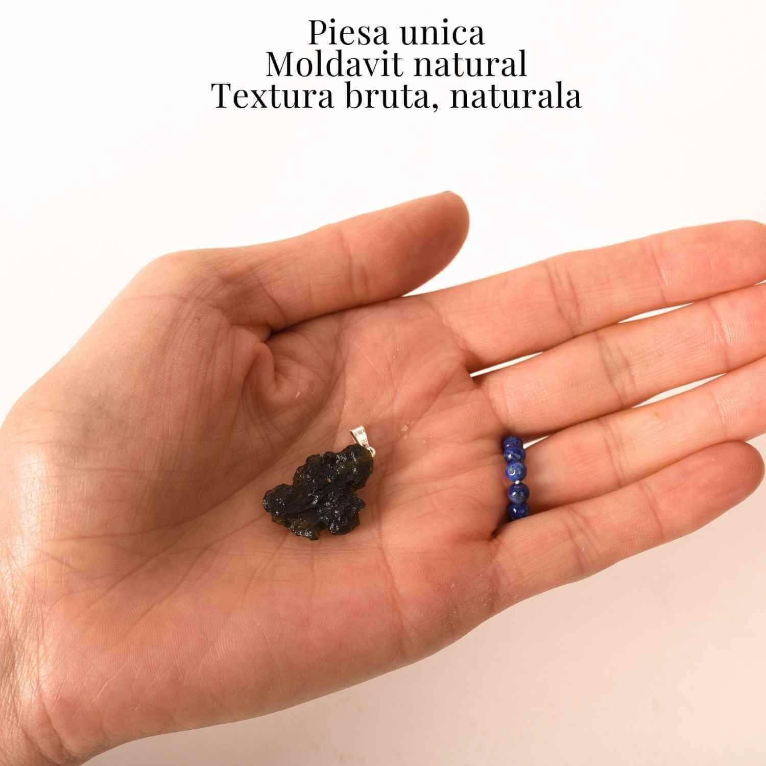 Acest colier din argint 925 evidențiază frumusețea brută și autentică a Moldavitului natural, fiecare piesă fiind diferită, cu textură și formă unică, exact așa cum natura a creat-o.