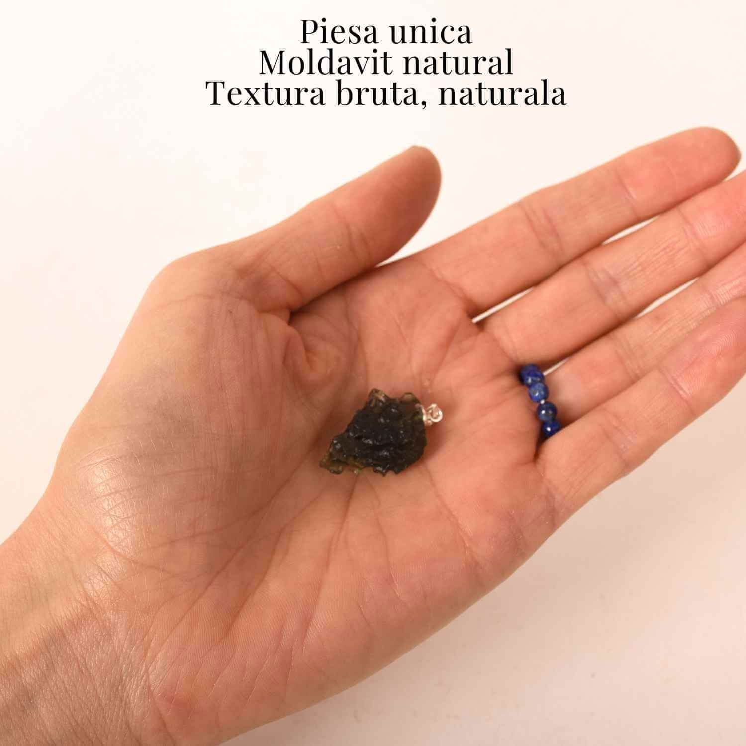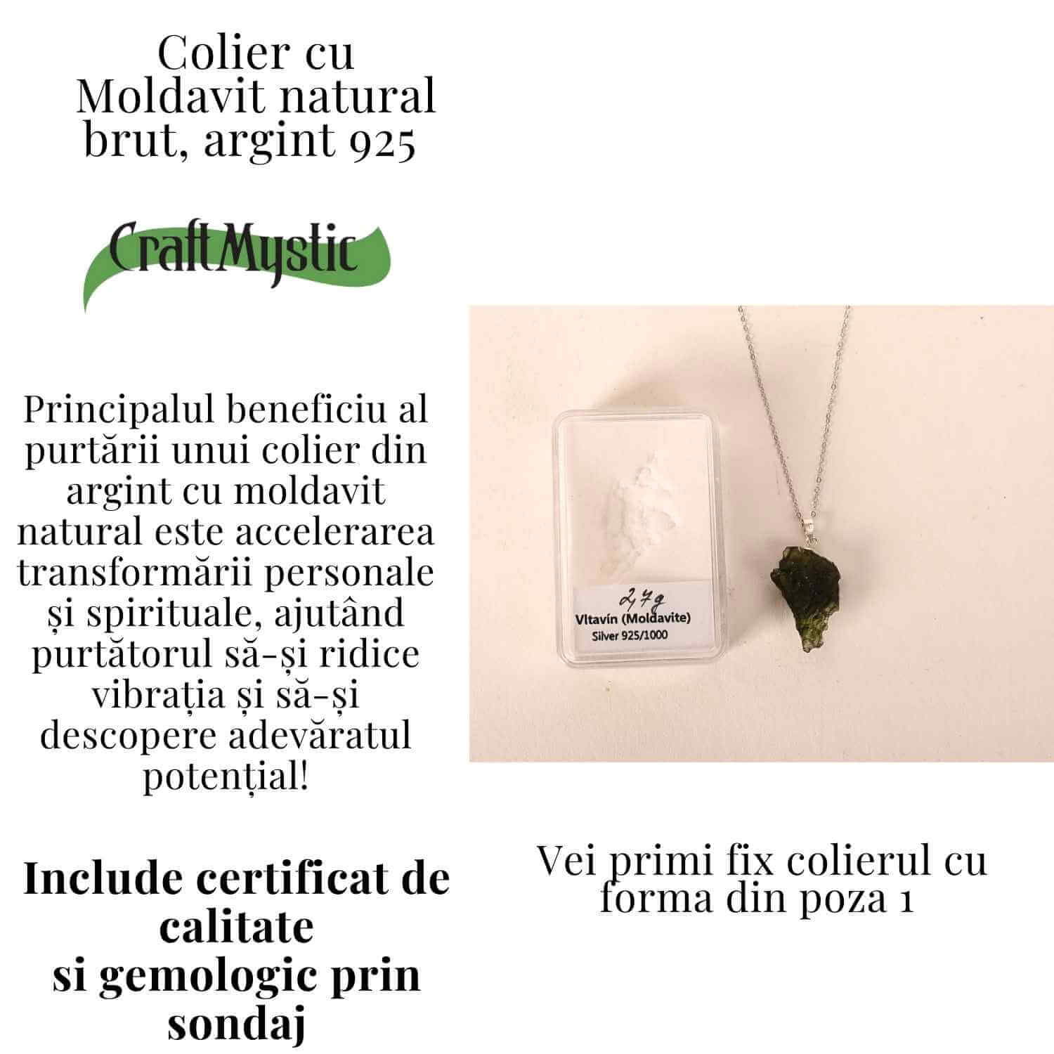 Acest colier din argint 925 evidențiază frumusețea brută și autentică a Moldavitului natural, fiecare piesă fiind diferită, cu textură și formă unică, exact așa cum natura a creat-o.