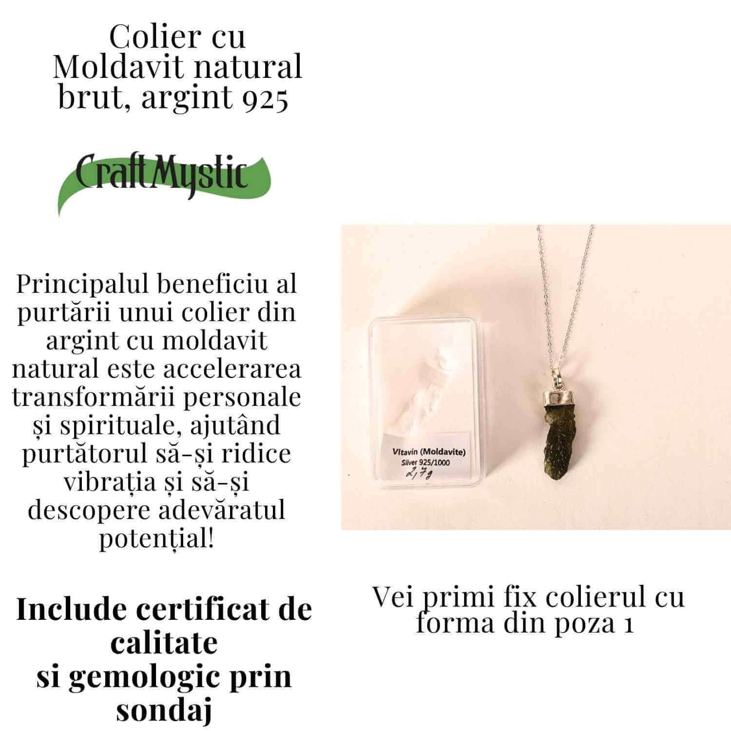 Dacă te afli într-un proces de schimbare – în carieră, relații sau dezvoltare personală – acest colier cu Moldavit natural te susține cu protecție, claritate mentală și curaj.