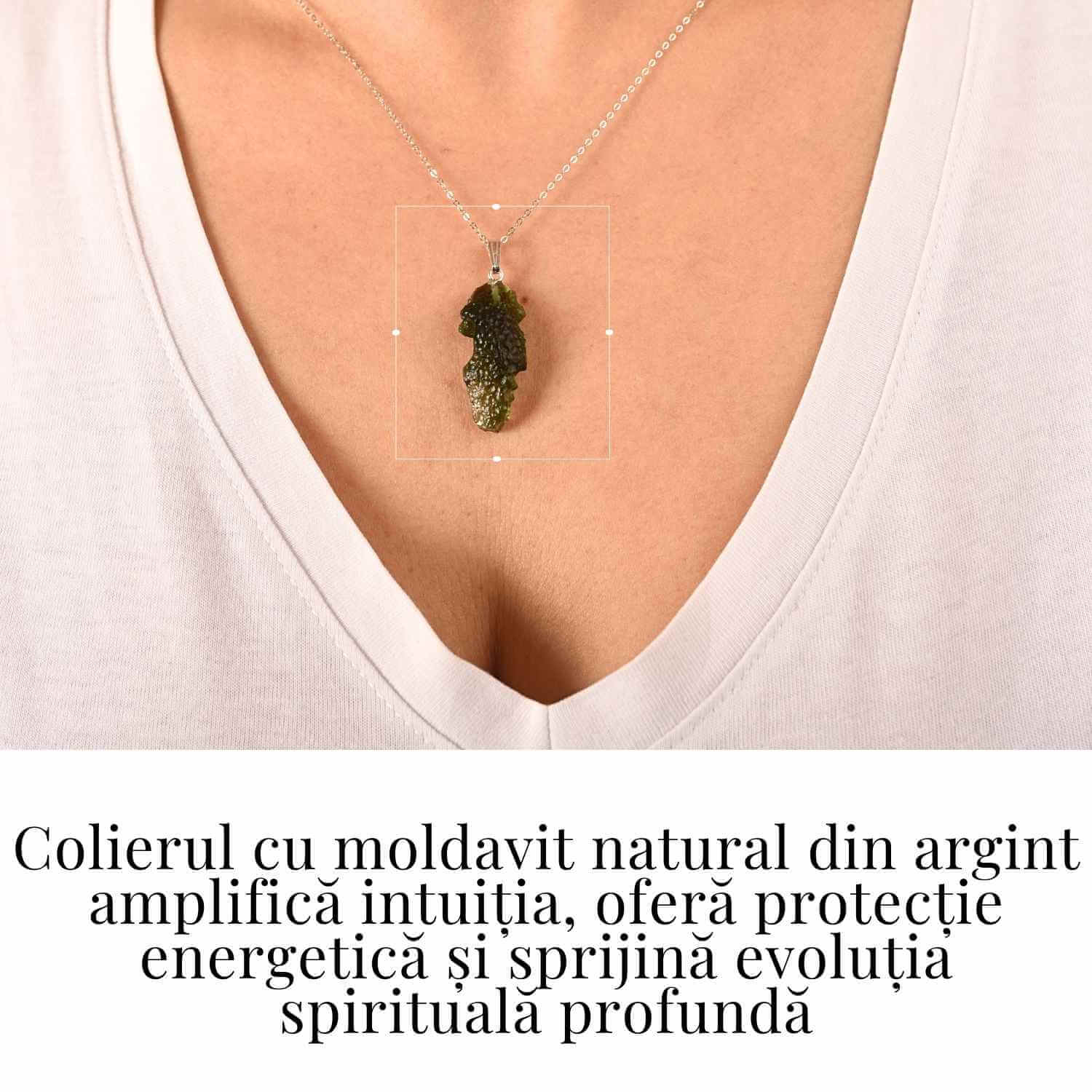 Dacă te afli într-un proces de schimbare – în carieră, relații sau dezvoltare personală – acest colier cu Moldavit natural te susține cu protecție, claritate mentală și curaj.