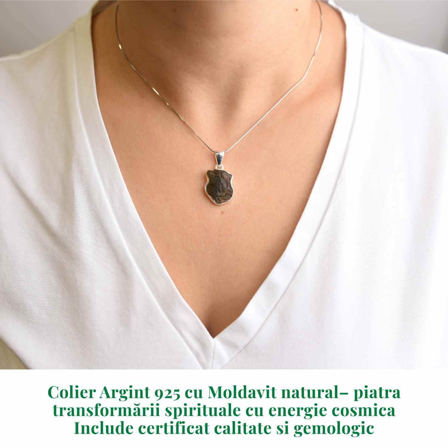 Descoperă un colier unic, realizat din argint 925 marcat și verificat ANPC, cu un fragment autentic de Moldavit natural din Cehia. Piatra are dimensiunea de aproximativ 18x18 mm, iar colierul cântărește 3.19 g împreună cu montura și lanțul.