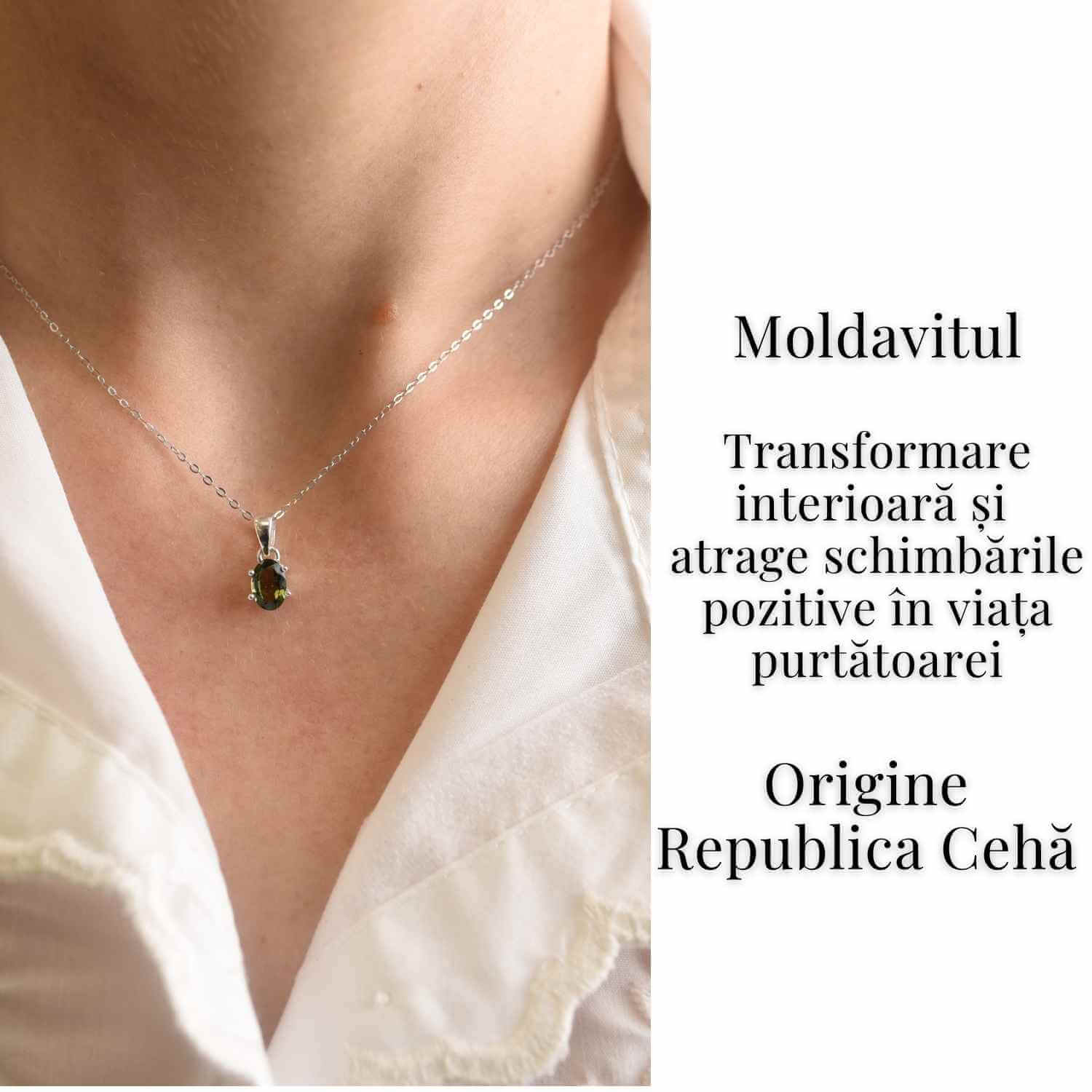 Acest colier cu Moldavit natural fațetat, în formă ovală, montat pe lanț fin din argint 925, este o bijuterie rară, cu vibrație înaltă, ce aduce claritate, protecție și susținere pe drumul evoluției personale. Creat pentru sufletul care simte, caută și se deschide spre lumină.