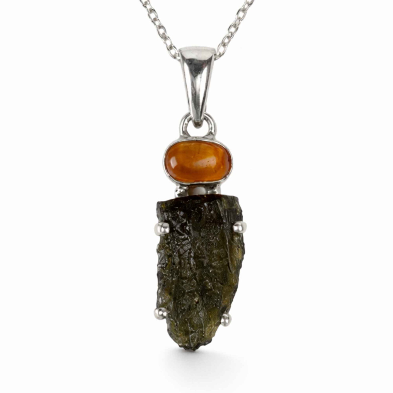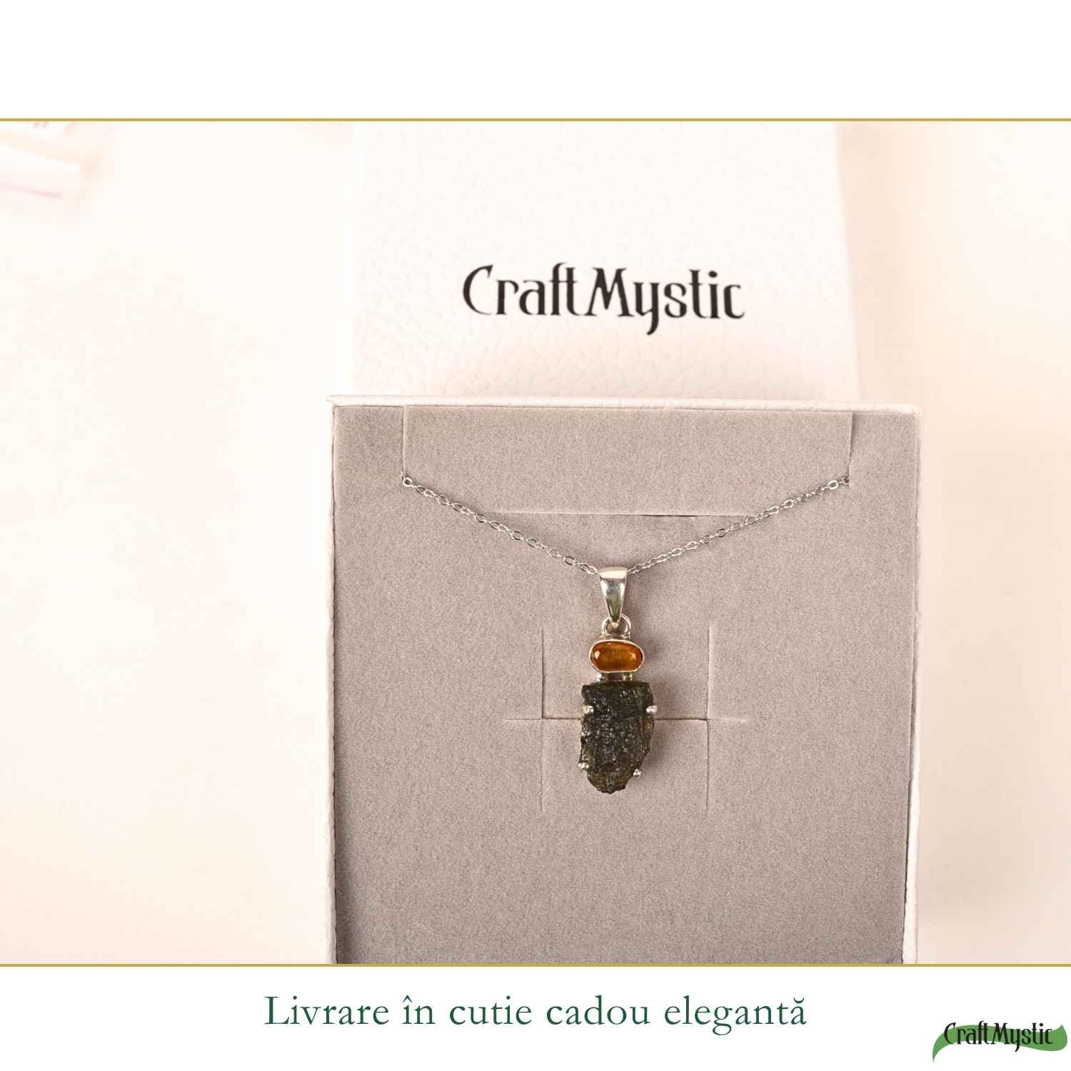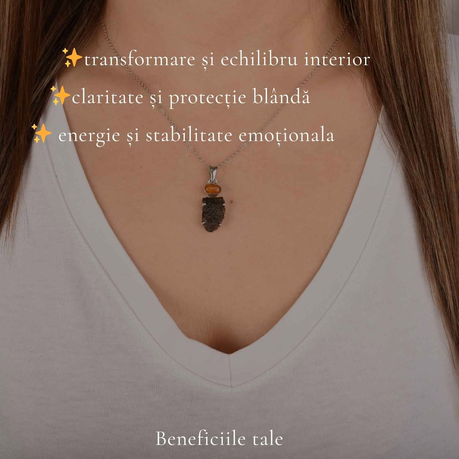 Un colier din argint 925 cu moldavit și chihlimbar natural, o combinație armonioasă între transformare și protecție, care îți aduce echilibru și claritate interioară.