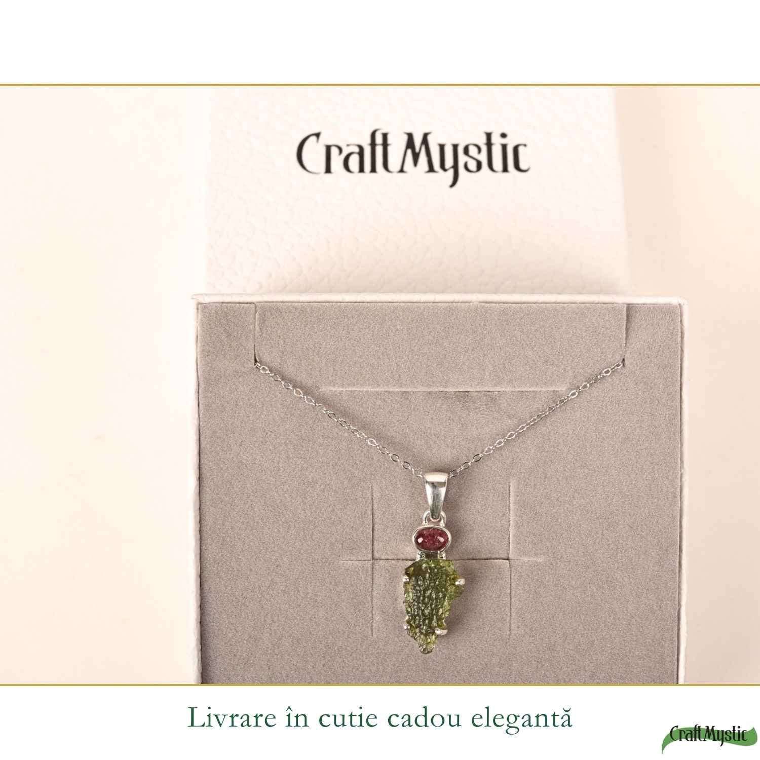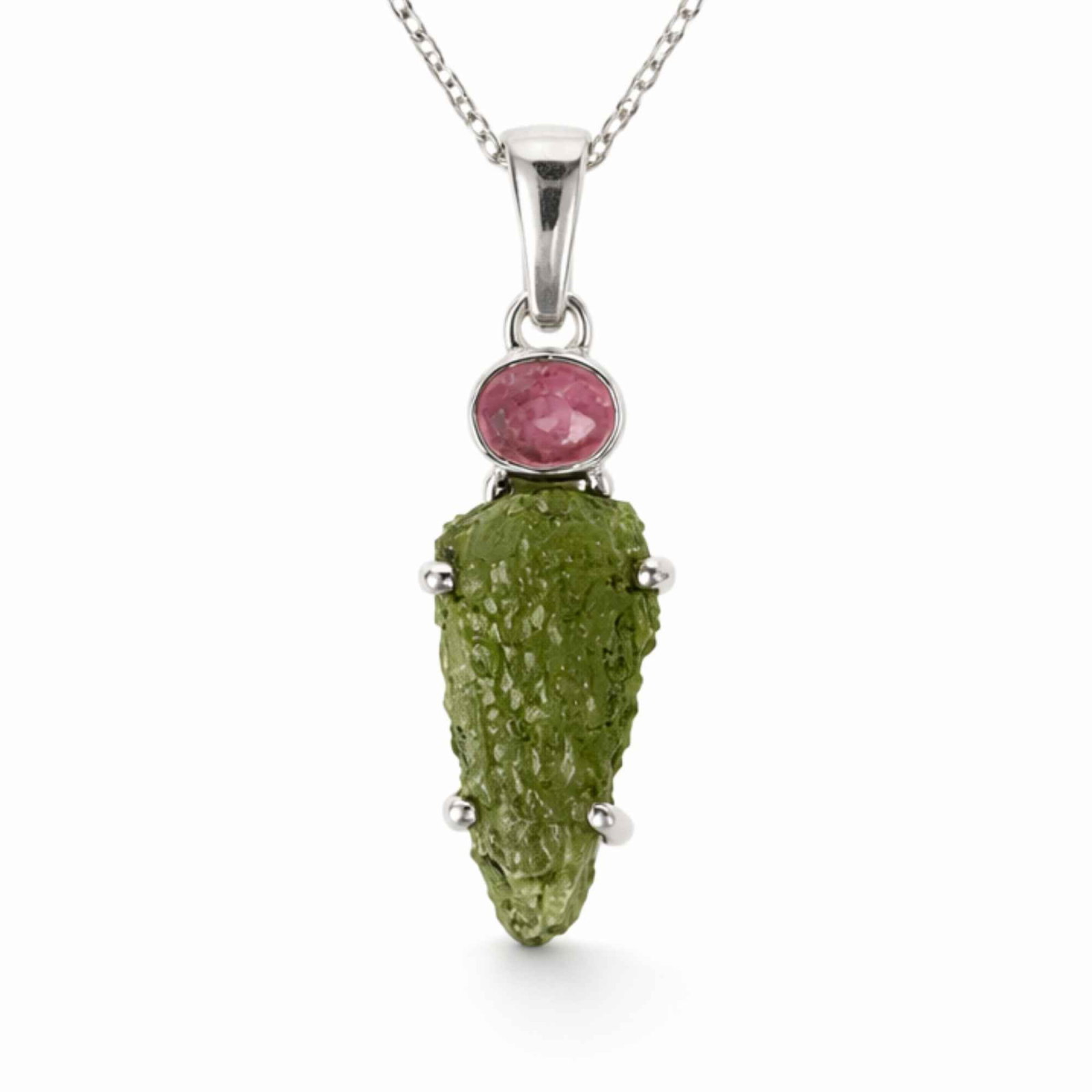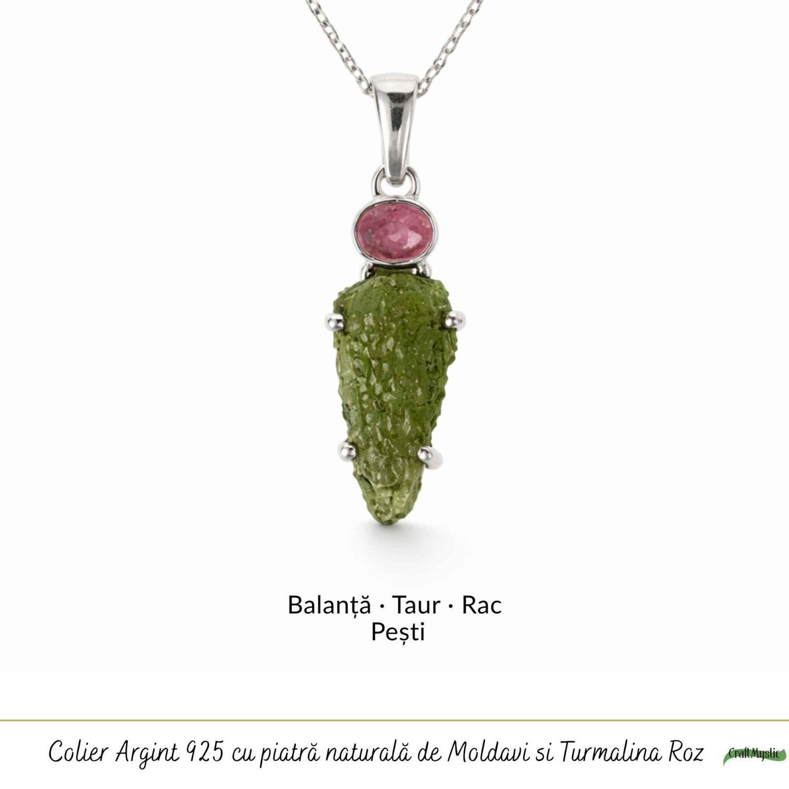Un colier din argint 925 cu moldavit și turmalină roz naturală, o combinație delicată care susține iubirea, echilibrul emoțional și transformarea interioară.