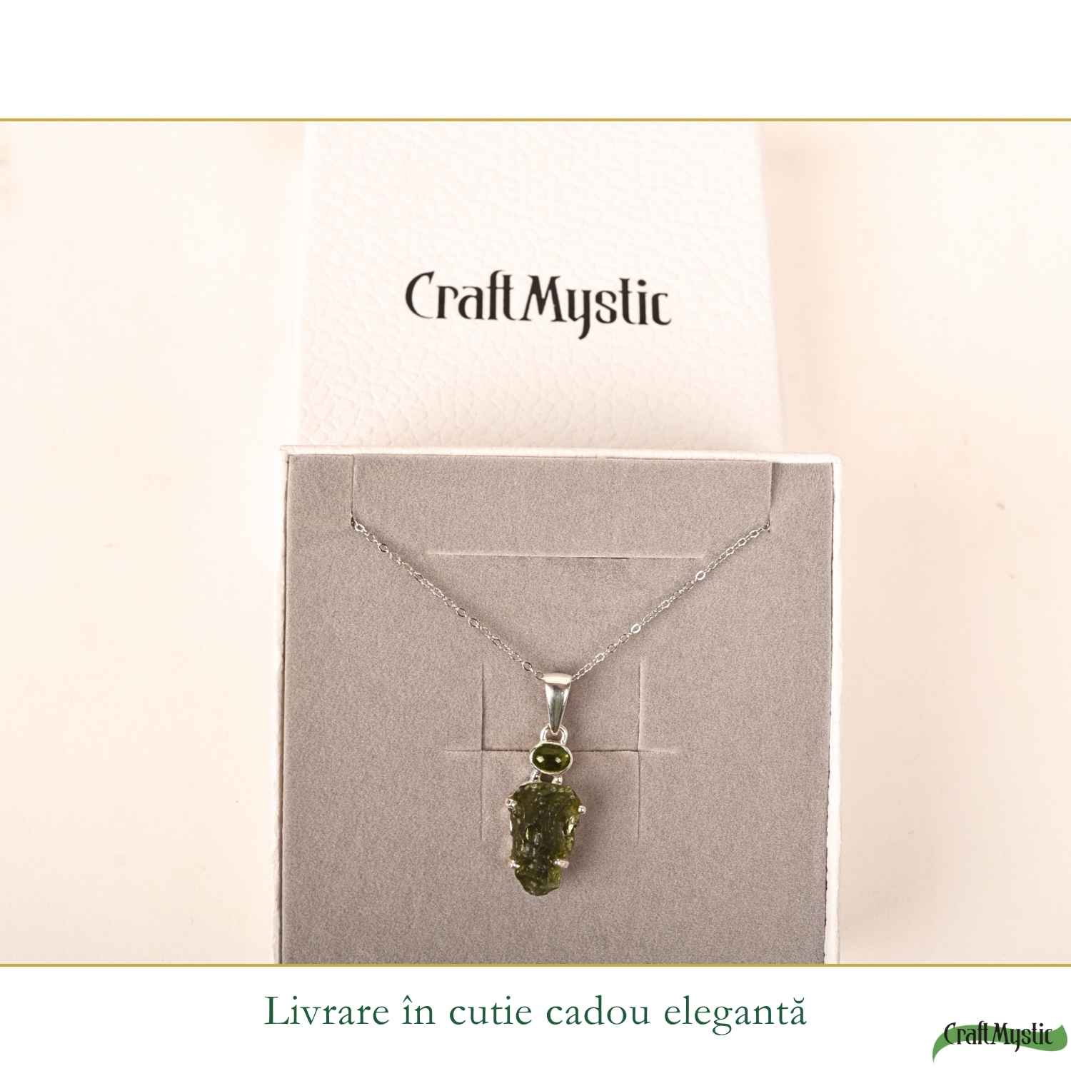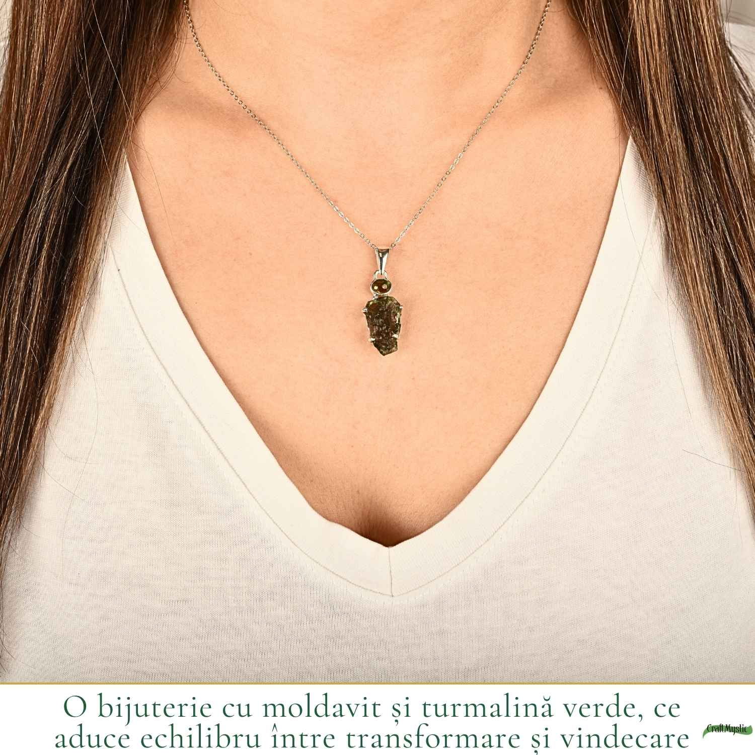 Un colier din argint 925 cu moldavit și turmalină verde naturală, o combinație echilibrată care susține liniștea interioară, claritatea și transformarea personală.