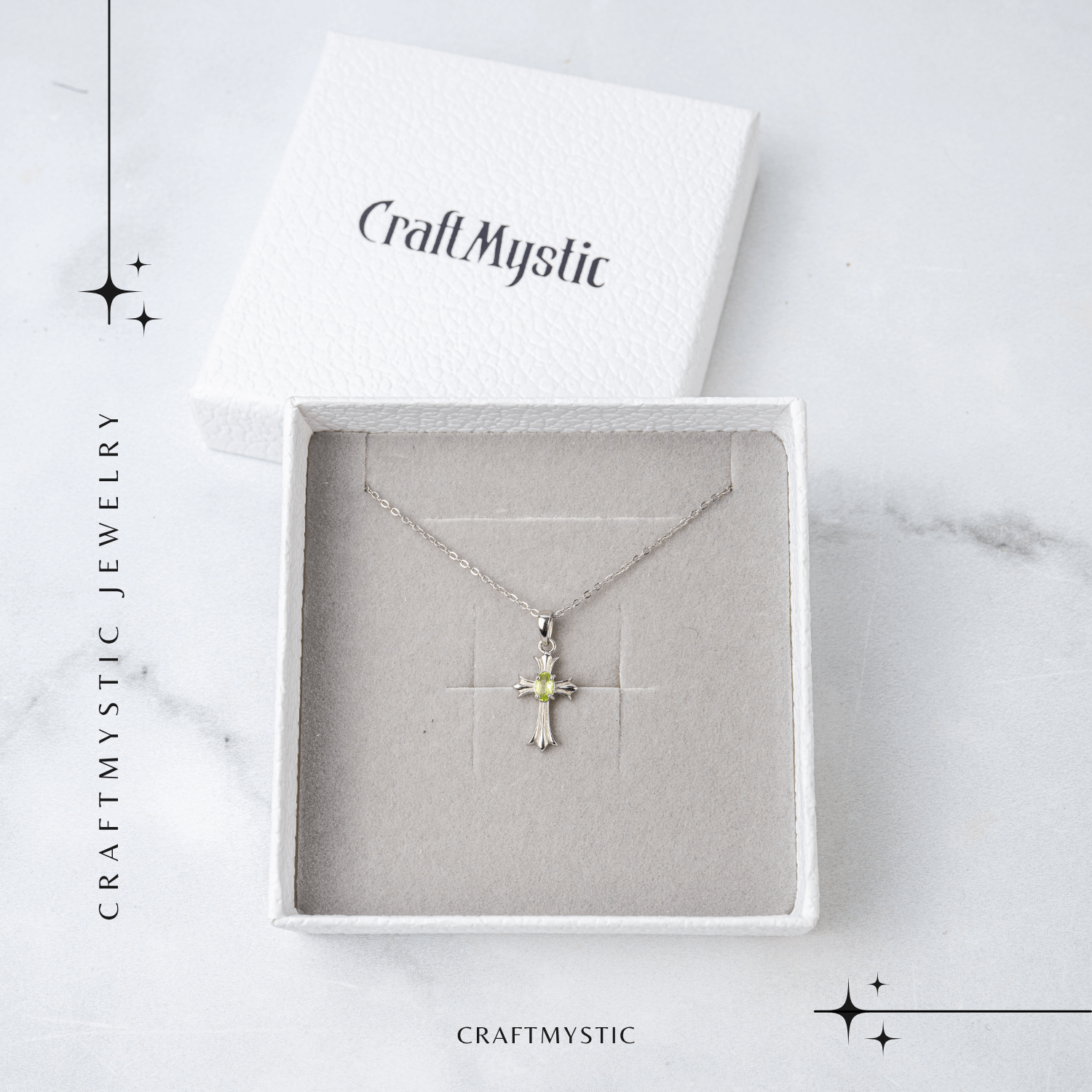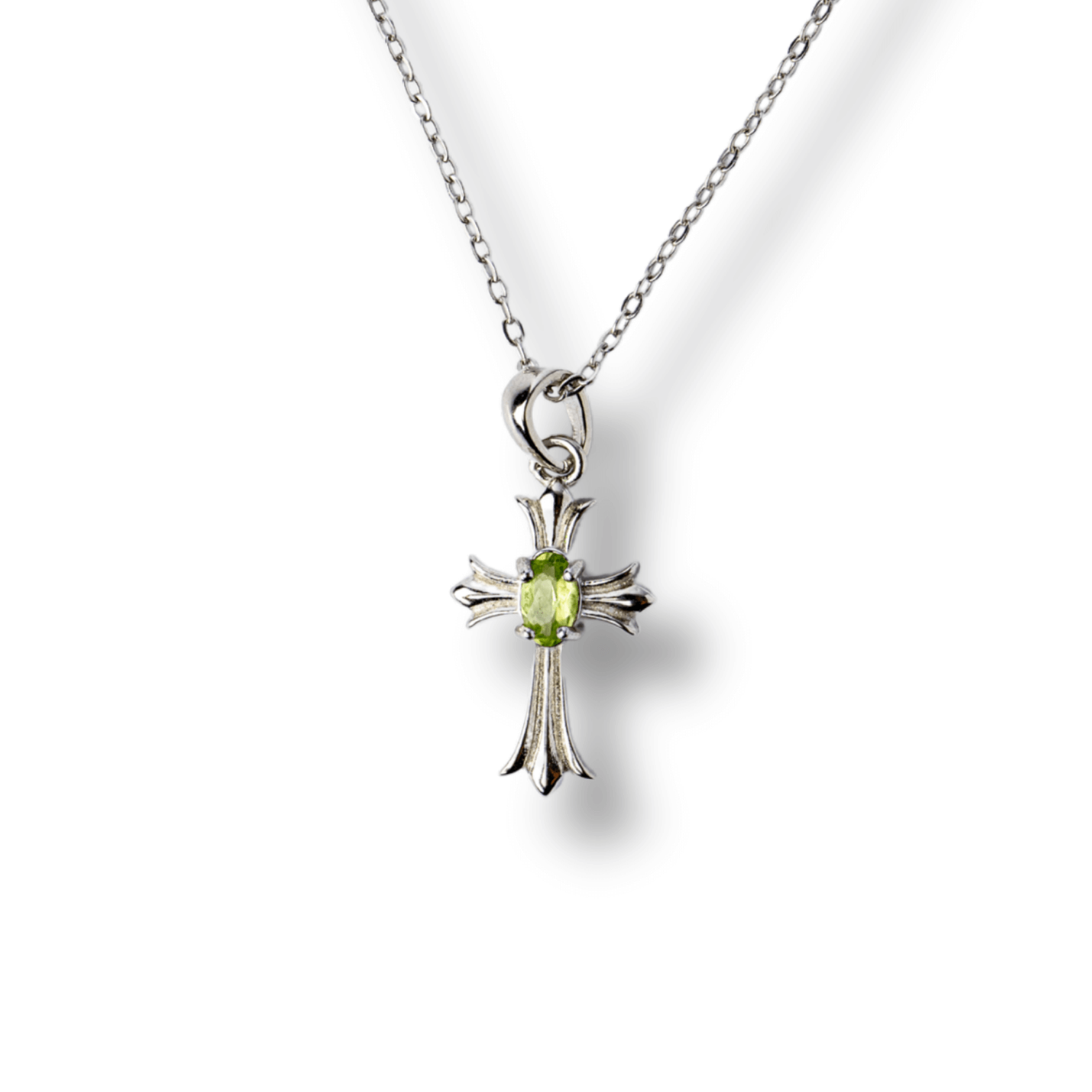 Crucea reprezintă puterea spirituală, protecția și centrul ființei, iar nuanța verde-luminoasă a Peridotului radiază prosperitate, armonie și vindecare energetică.