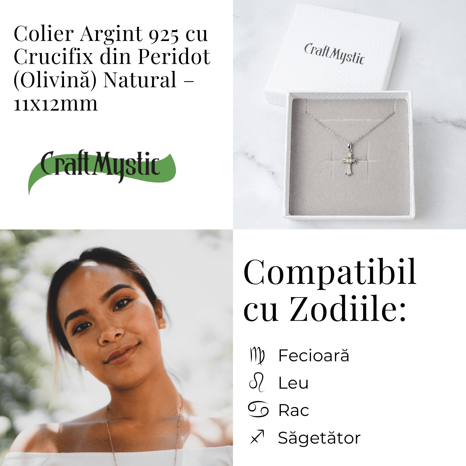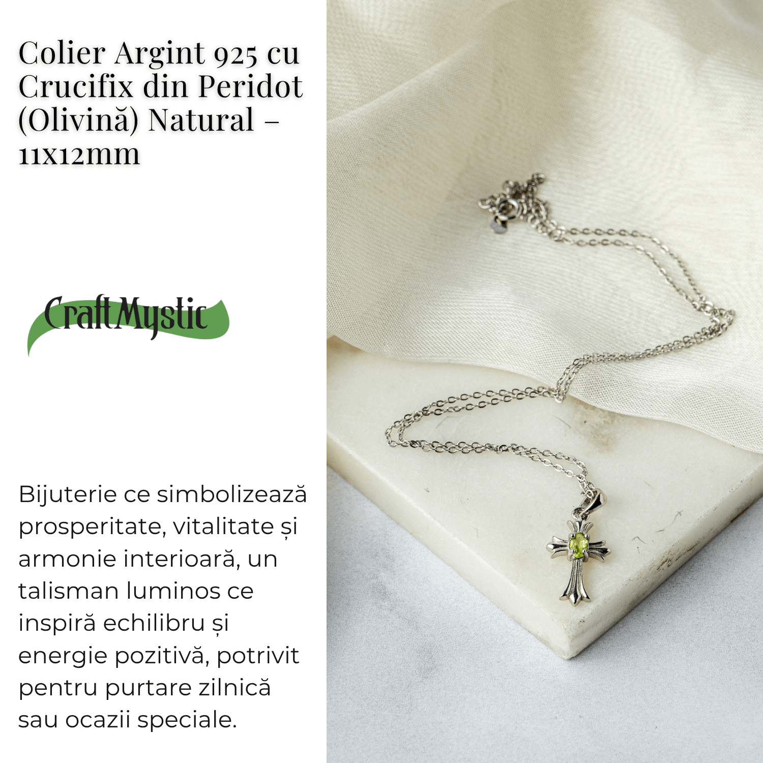 Un talisman al luminii și credinței, acest colier din Argint 925 cu Peridot natural reunește două simboluri sacre – Crucea, emblema echilibrului dintre cer și pământ, și Peridotul, piatra regenerării și a bucuriei de a trăi.