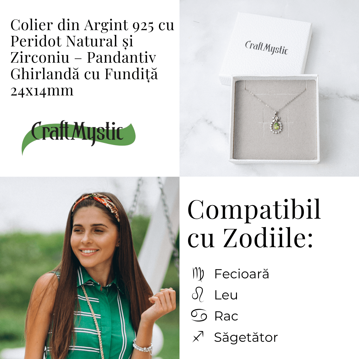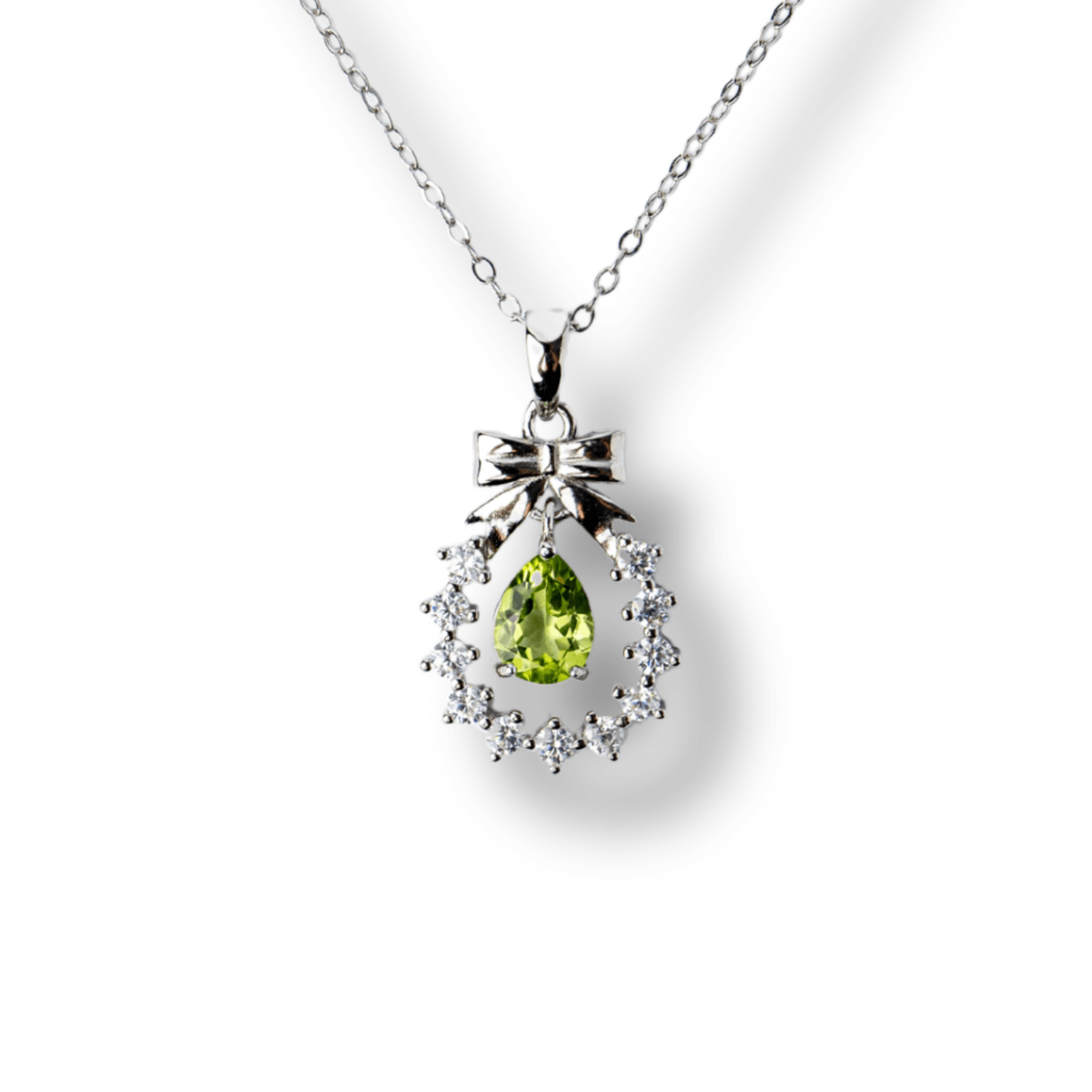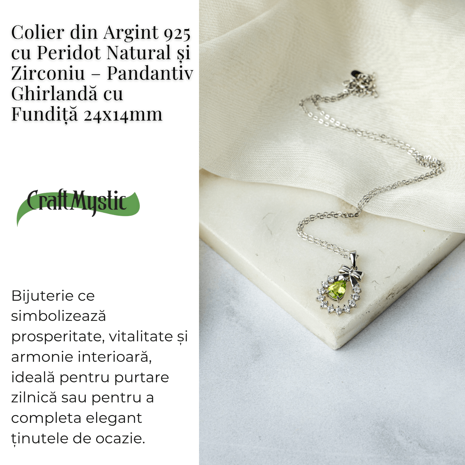 Acest colier rafinat din Argint 925 cu Peridot natural este o bijuterie ce uneste simbolismul delicat al ghirlandei și fundiței cu energia regeneratoare a cristalului de Peridot.