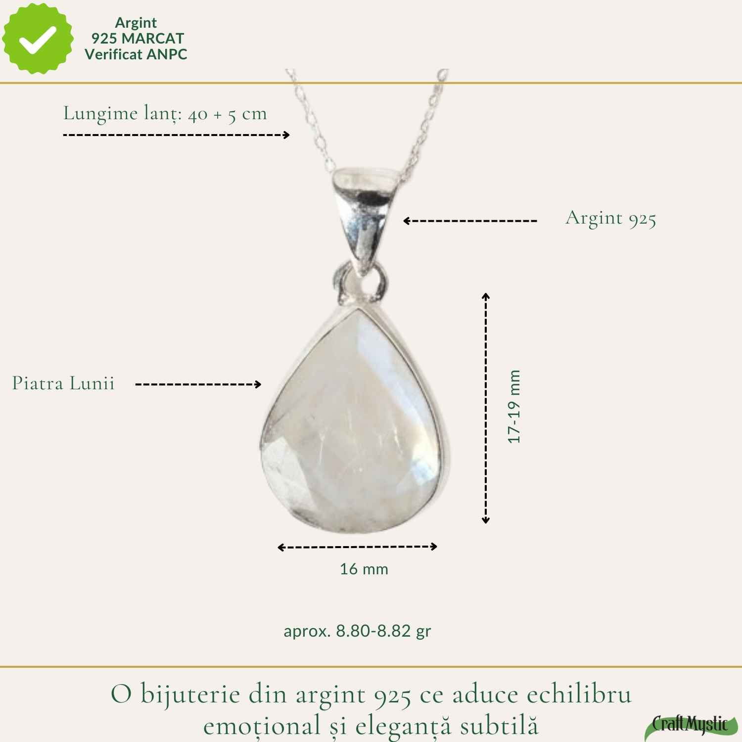 Colier din argint 925 cu Piatra Lunii naturală în formă de lacrimă, simbol al emoției și intuiției. O bijuterie elegantă și cu prezență, care îți aduce echilibru și feminitate în fiecare zi.