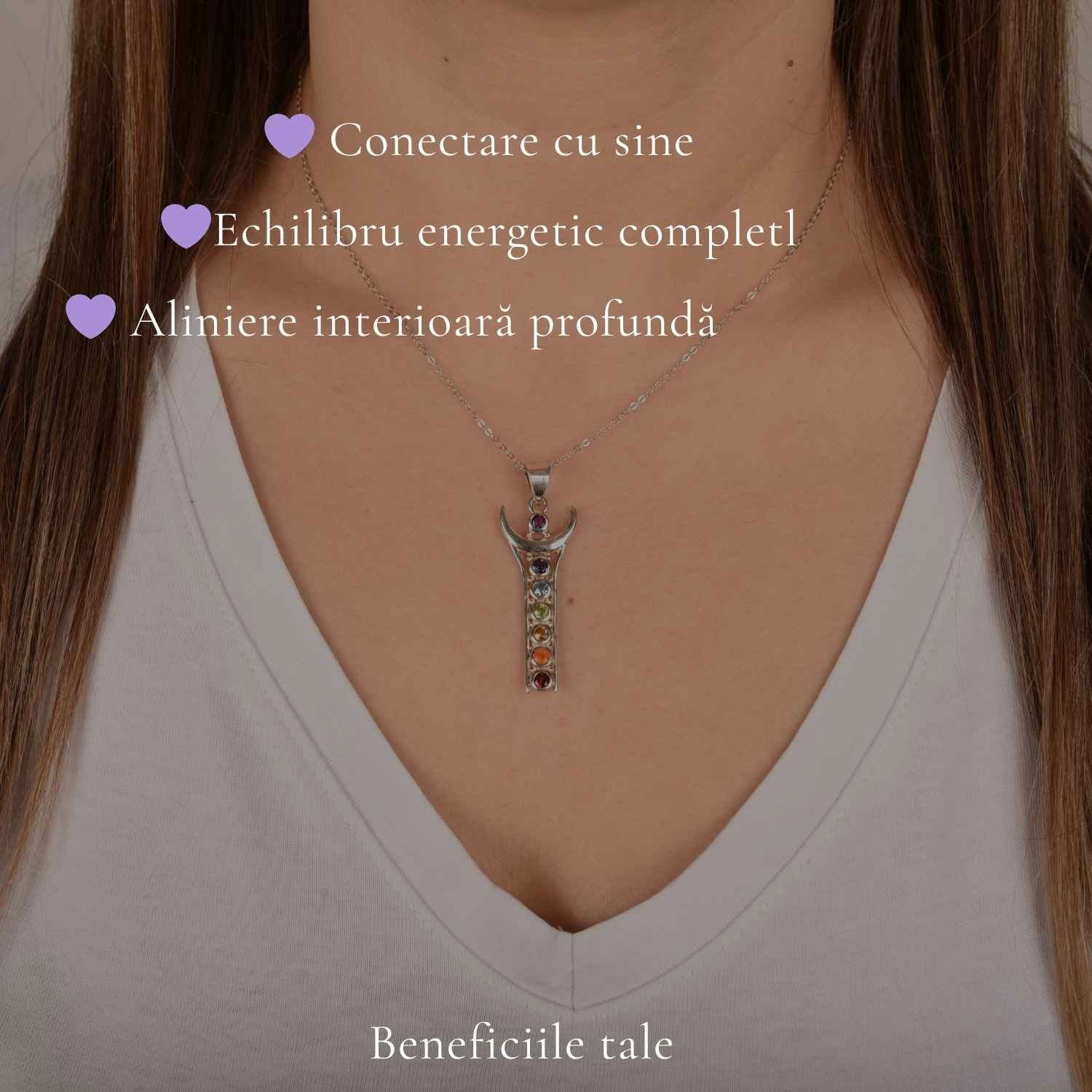Colierul este realizat din combinația celor 7 pietre asociate chakrelor principale, fiecare reprezentând un centru energetic din corp. Împreună, aceste pietre creează un flux armonios de energie, susținând echilibrul interior și starea de bine. Este o bijuterie cu semnificație profundă, purtată pentru aliniere și reconectare.