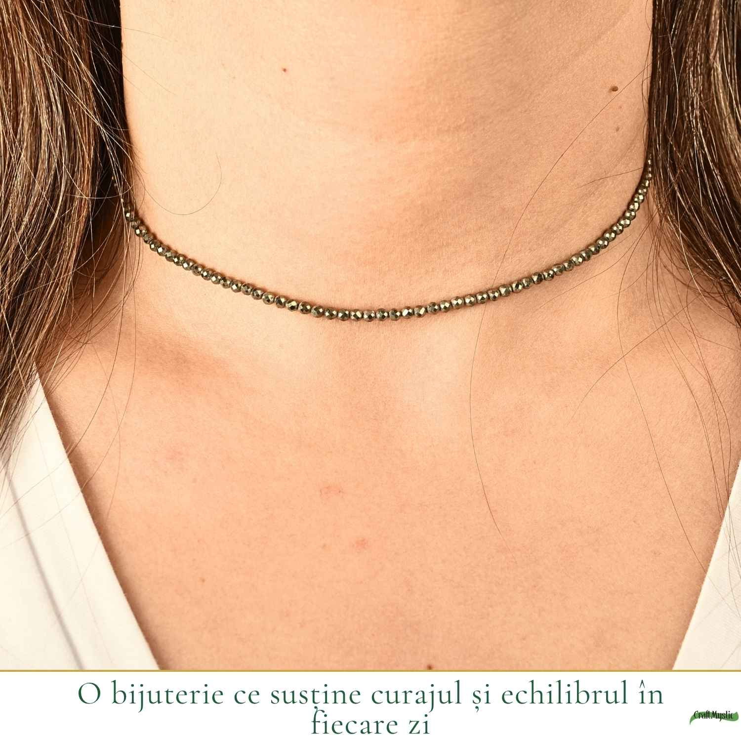 Colierul fin cu mărgele de pirită îți aduce acea energie de încredere și eleganță naturală.