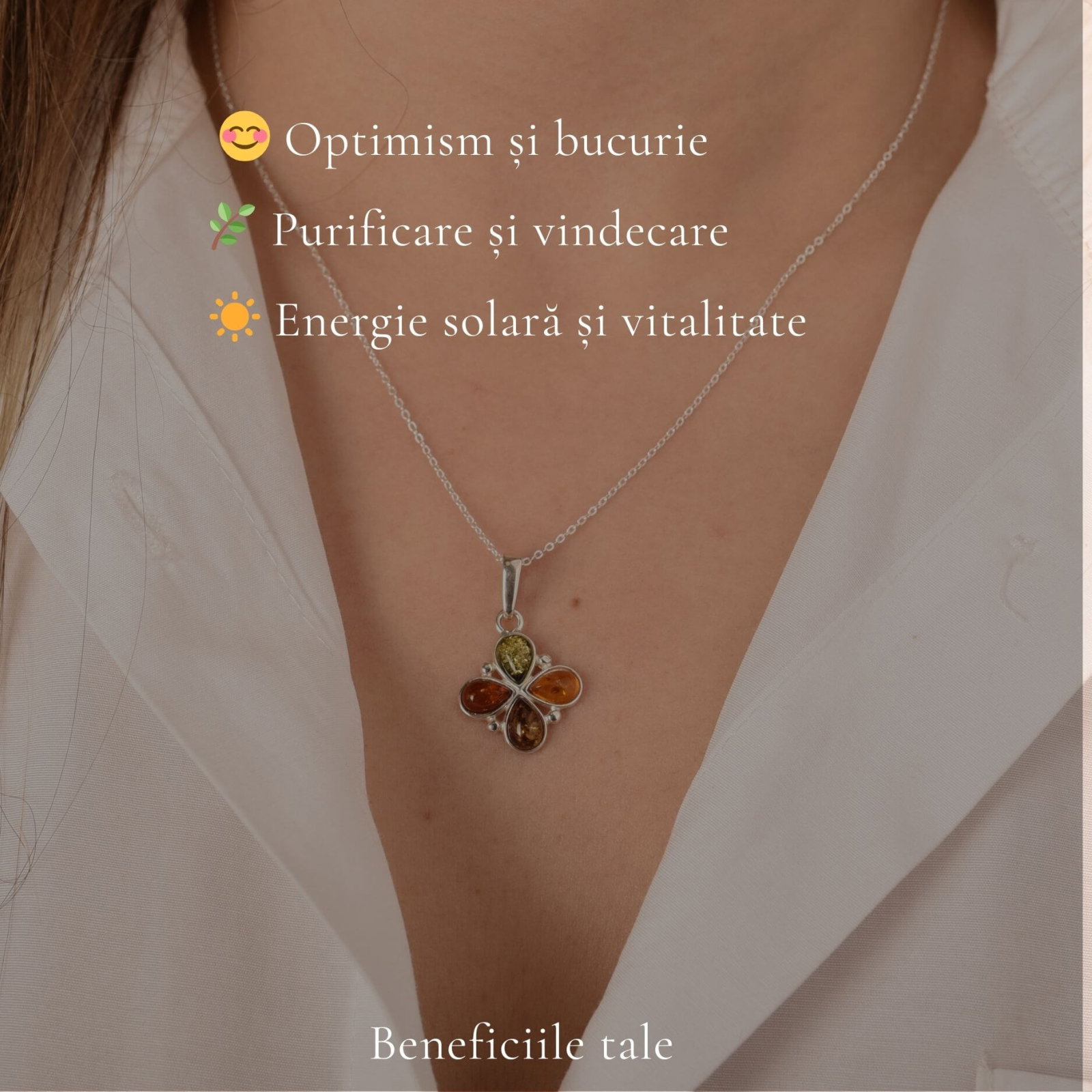 Fiecare nuanță de chihlimbar colorat reflectă o vibrație caldă, solară, care aduce bucurie și stare de bine. Este ușor, plăcut la atingere și perfect pentru purtare zilnică.