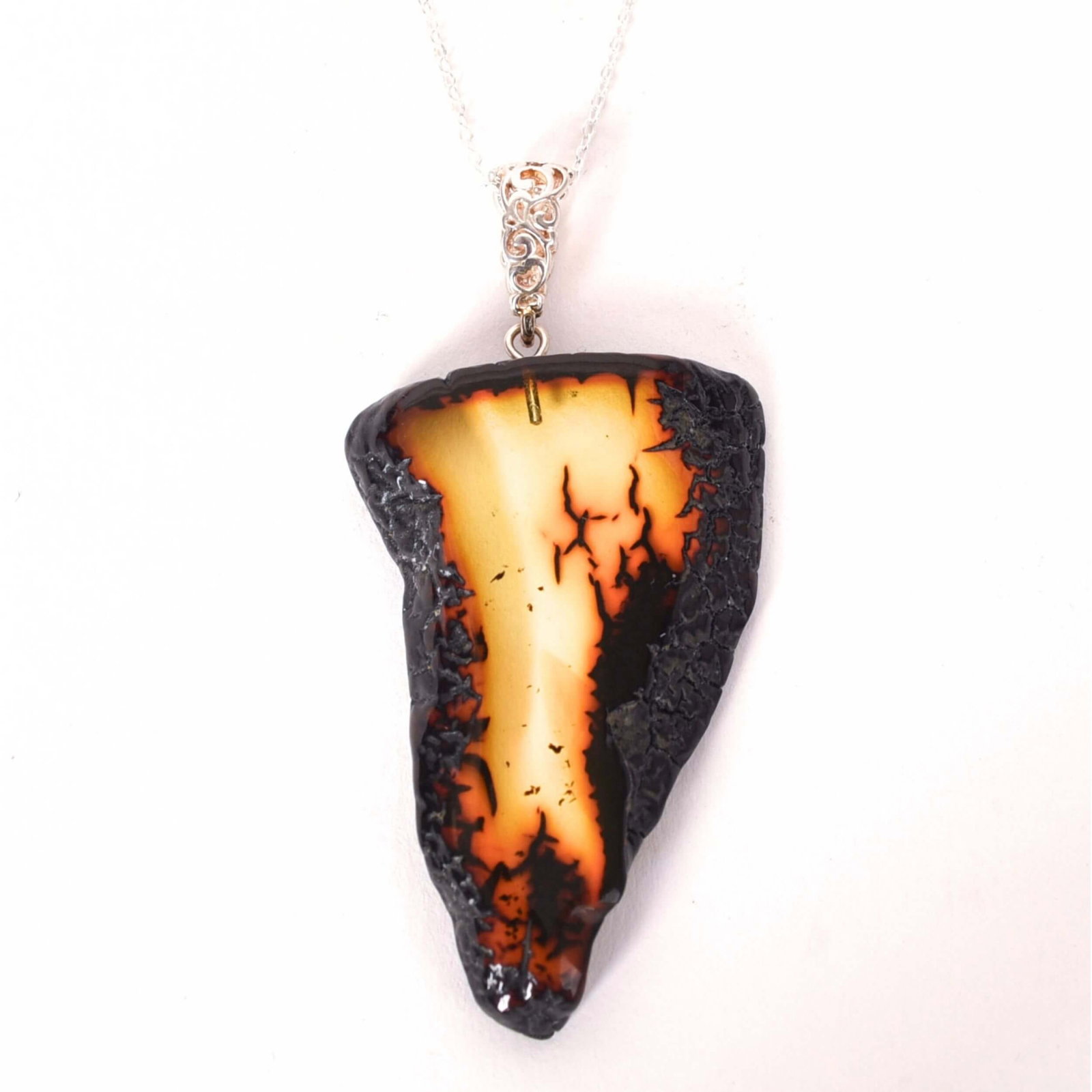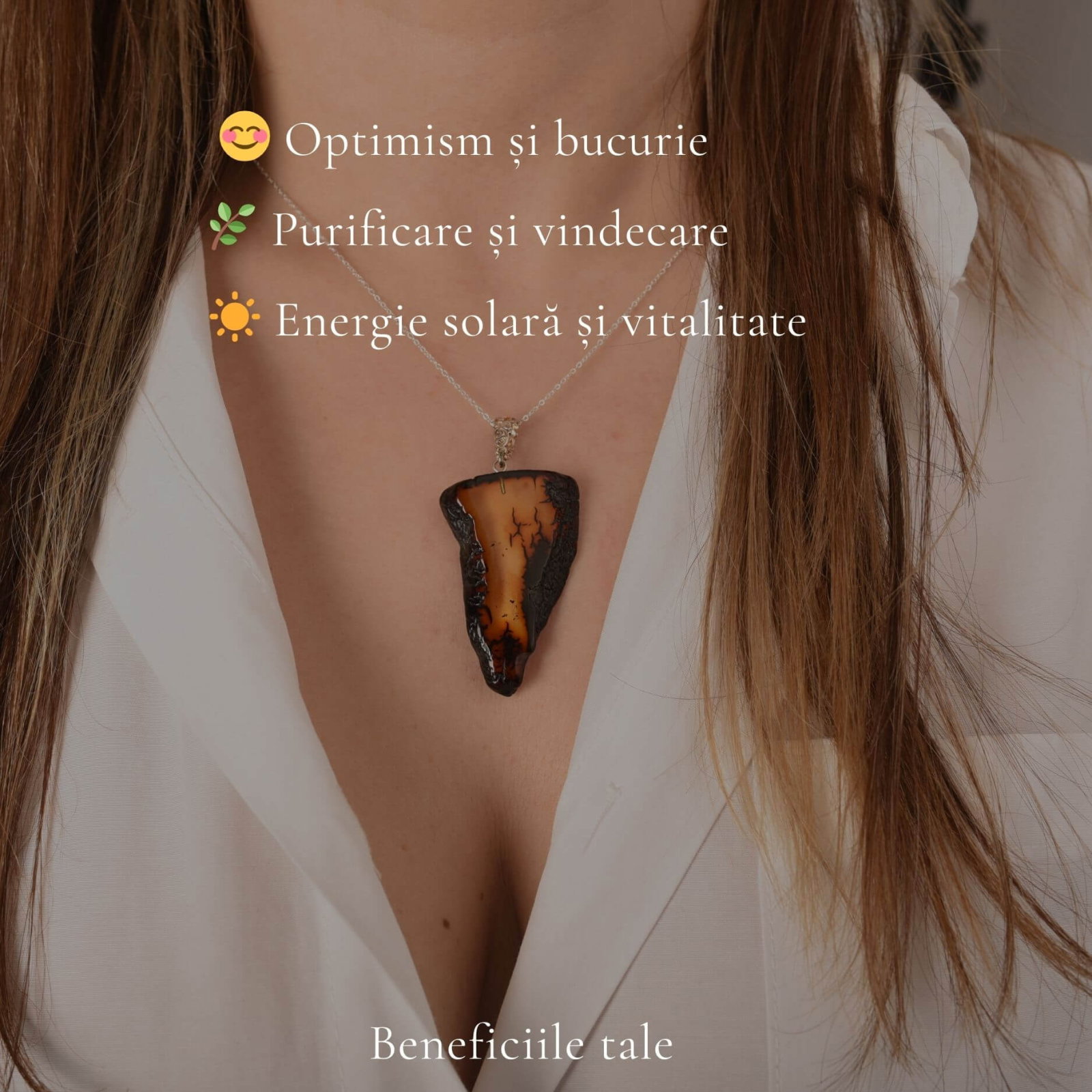Triunghiul cu chihlimbar natural este o piesă cu prezență, un simbol al echilibrului și al energiei tale interioare.