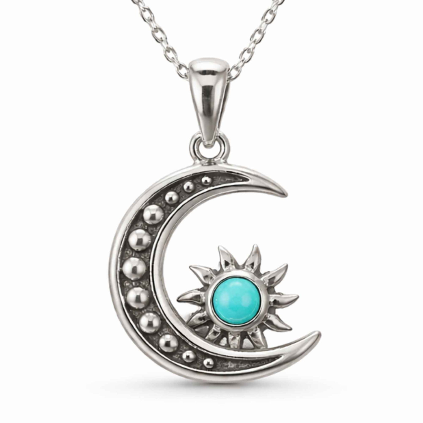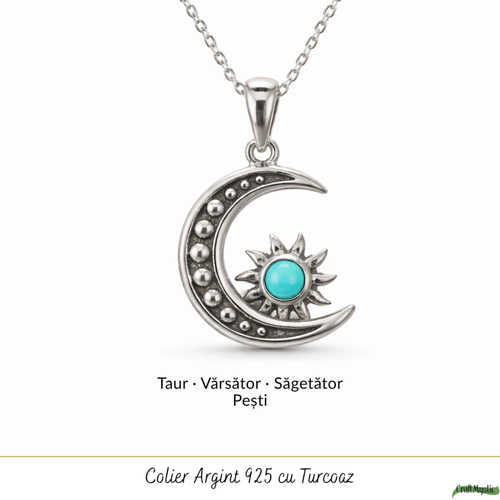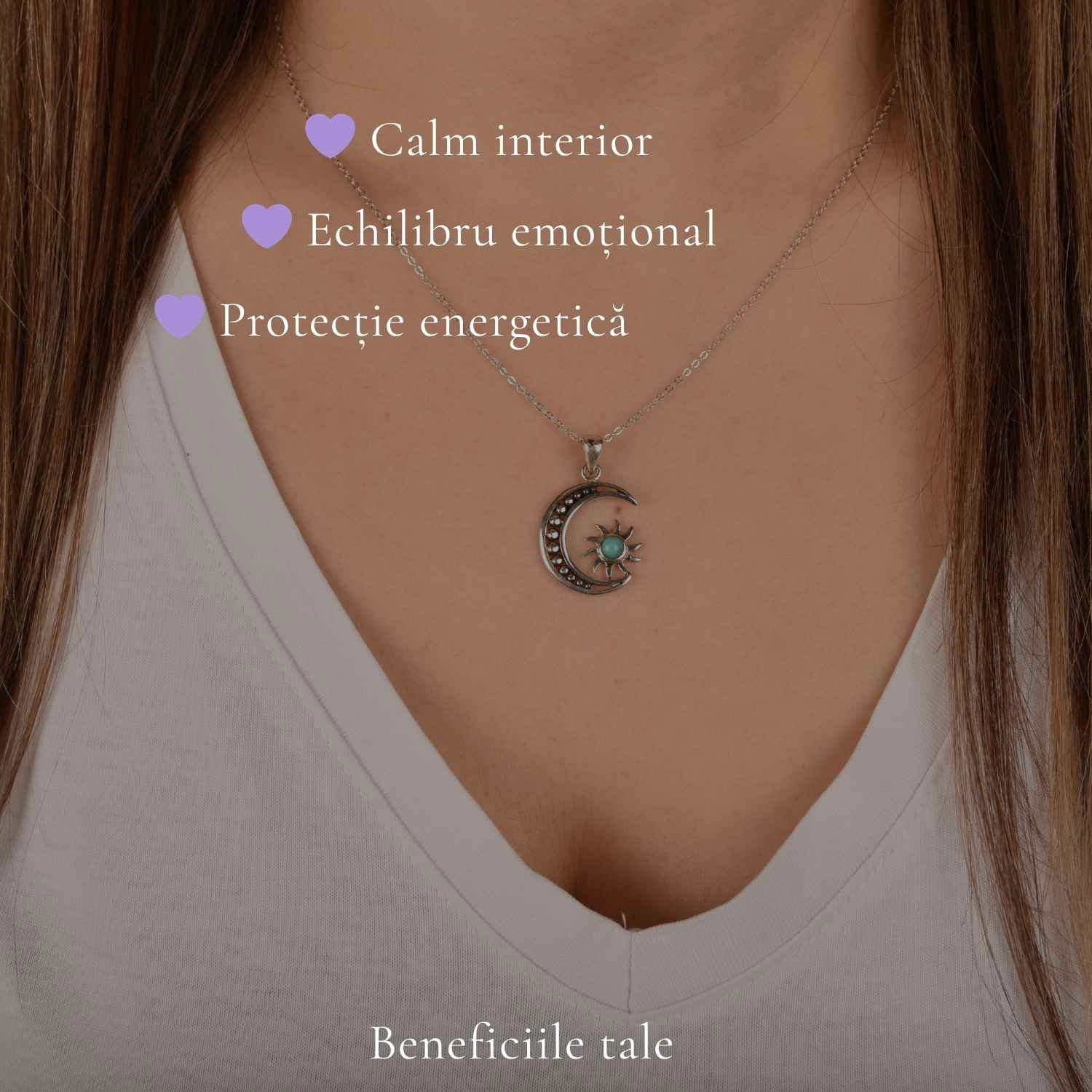 Colier din argint 925 cu Turcoaz natural, decorat cu simbolul semilunii și soarelui – un talisman al echilibrului și protecției. Ușor și plin de semnificație, îl porți zilnic ca să rămâi conectat(ă) la tine.