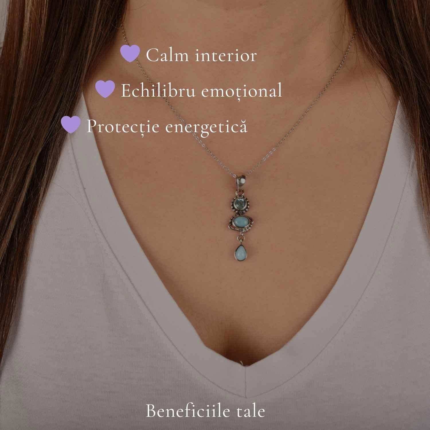 Colier din argint 925 cu Turcoaz și Topaz albastru natural, cu forme delicate – lacrimă, oval și rotund. O bijuterie feminină, ușoară și elegantă, care aduce claritate și echilibru în fiecare zi.